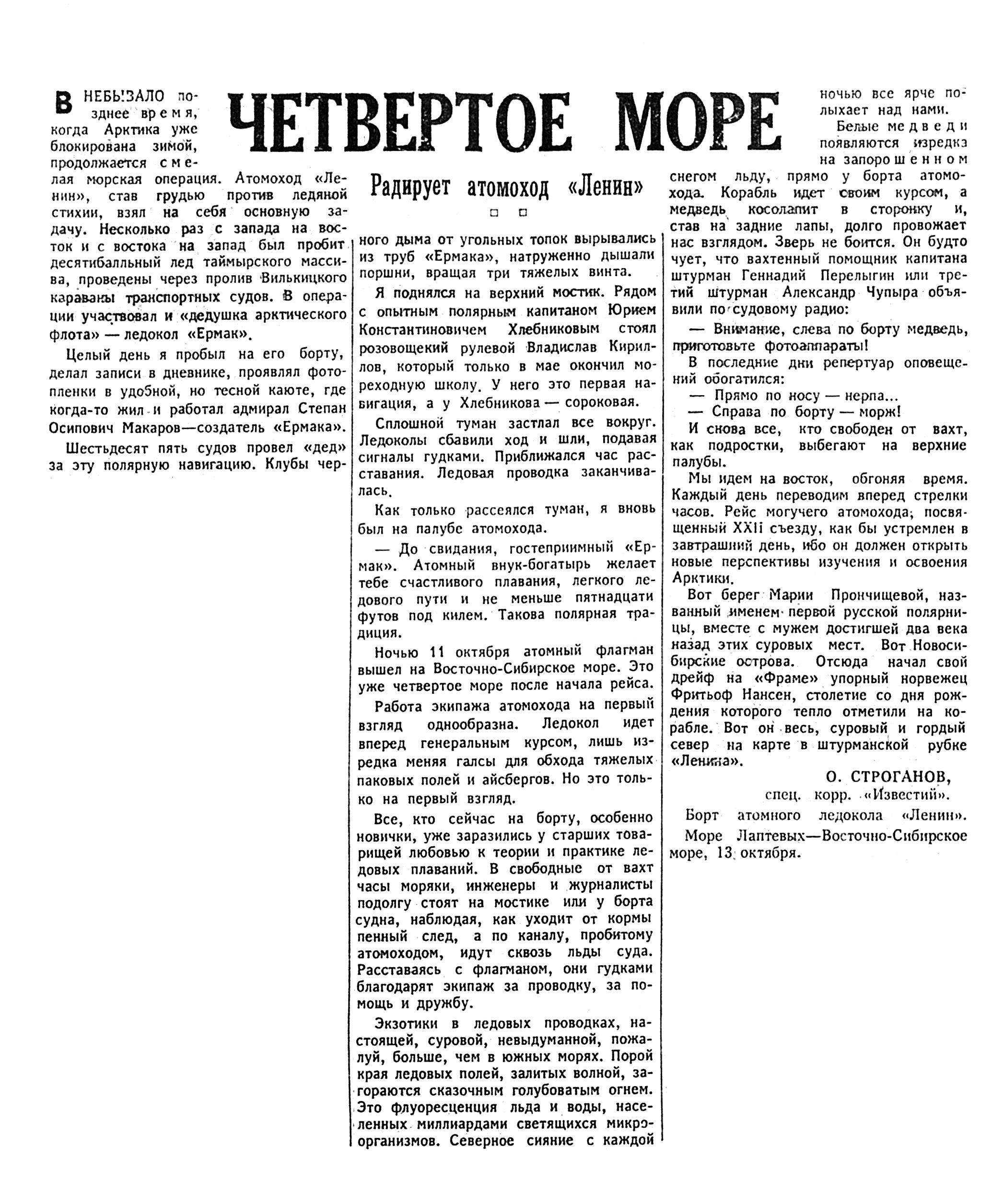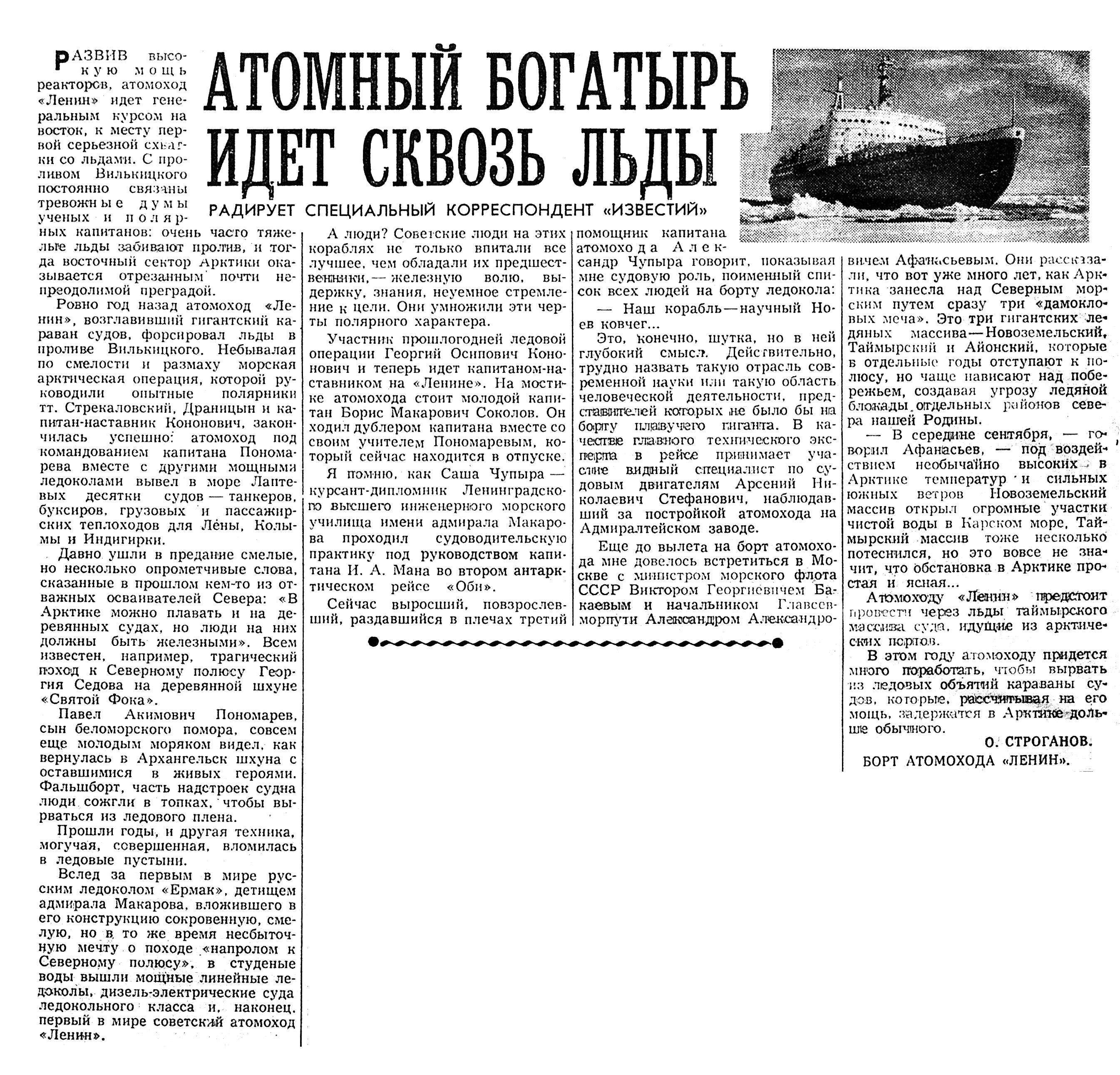 Ровно год назад атомоход «Ленин», возглавивший гигантский караван судов, форсировал льды в проливе Вилькицкого. Небывалая по смелости и размаху морская арктическая операция, которой руководили опытные полярники тт. Стрекаловский, Драницын и капитан-наставник Кононович, закончилась успешно: атомоход под командованием капитана Пономарева вместе с другими мощными ледоколами вывел в морс Лаптевых десятки судов — танкеров, буксиров, грузовых и пассажирских теплоходов для Лены, Колымы и Индигирки.