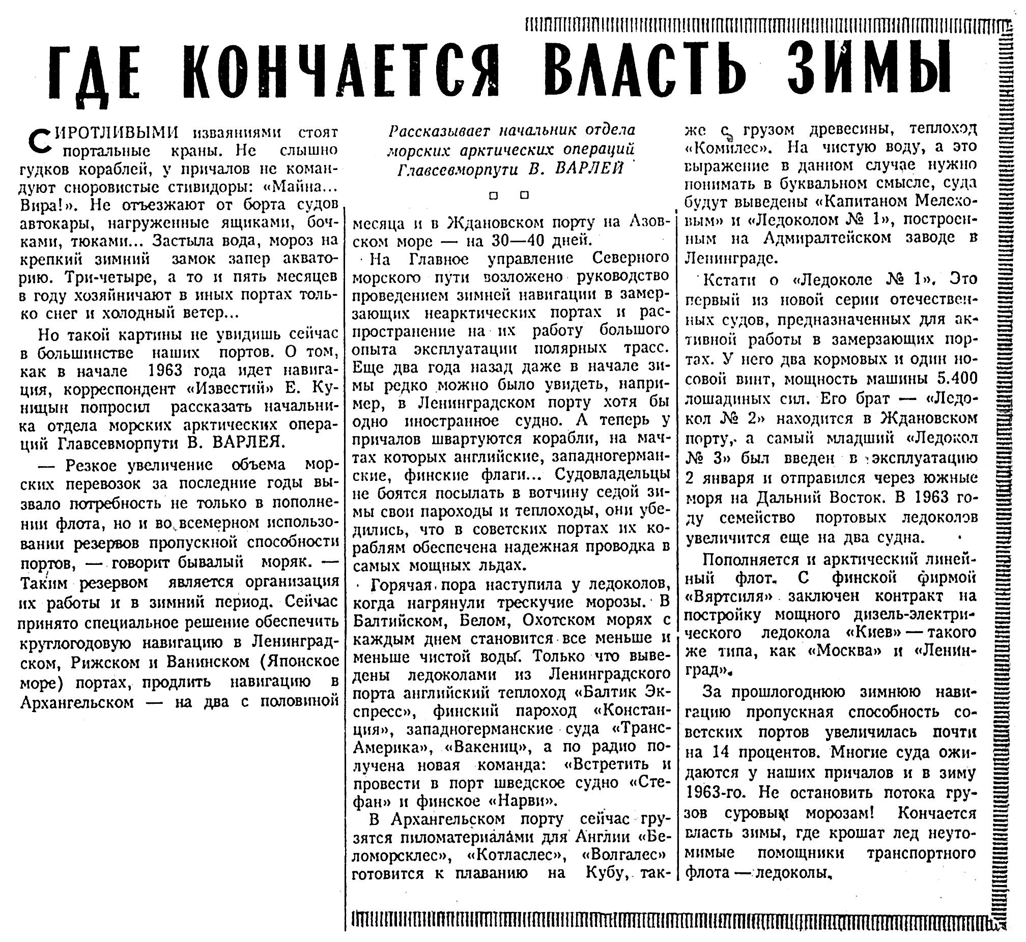 Но такой картины не увидишь сейчас в большинстве наших портов. О том, как в начале 1963 года идет навигация, корреспондент «Известий» Е. Куницын попросил рассказать начальника отдела морских арктических операций Главсевморпути В. ВАРЛЕЯ.