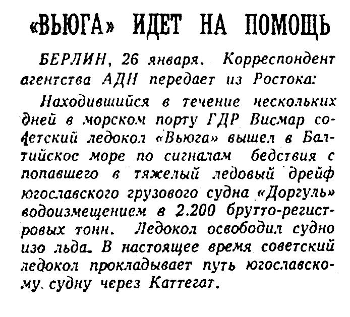 БЕРЛИН, 26 января. Корреспондент агентства АДН передает из Ростока: Находившийся в течение нескольких дней в морском порту ГДР Висмар советский ледокол «Вьюга» вышел в Балтийское море по сигналам бедствия с попавшего в тяжелый ледовый дрейф югославского грузового судна «Доргуль» водоизмещением в 2.200 брутто-регистровых тонн. Ледокол освободил судно изо льда. В настоящее время советский ледокол прокладывает путь югославскому. судну через Каттегат.