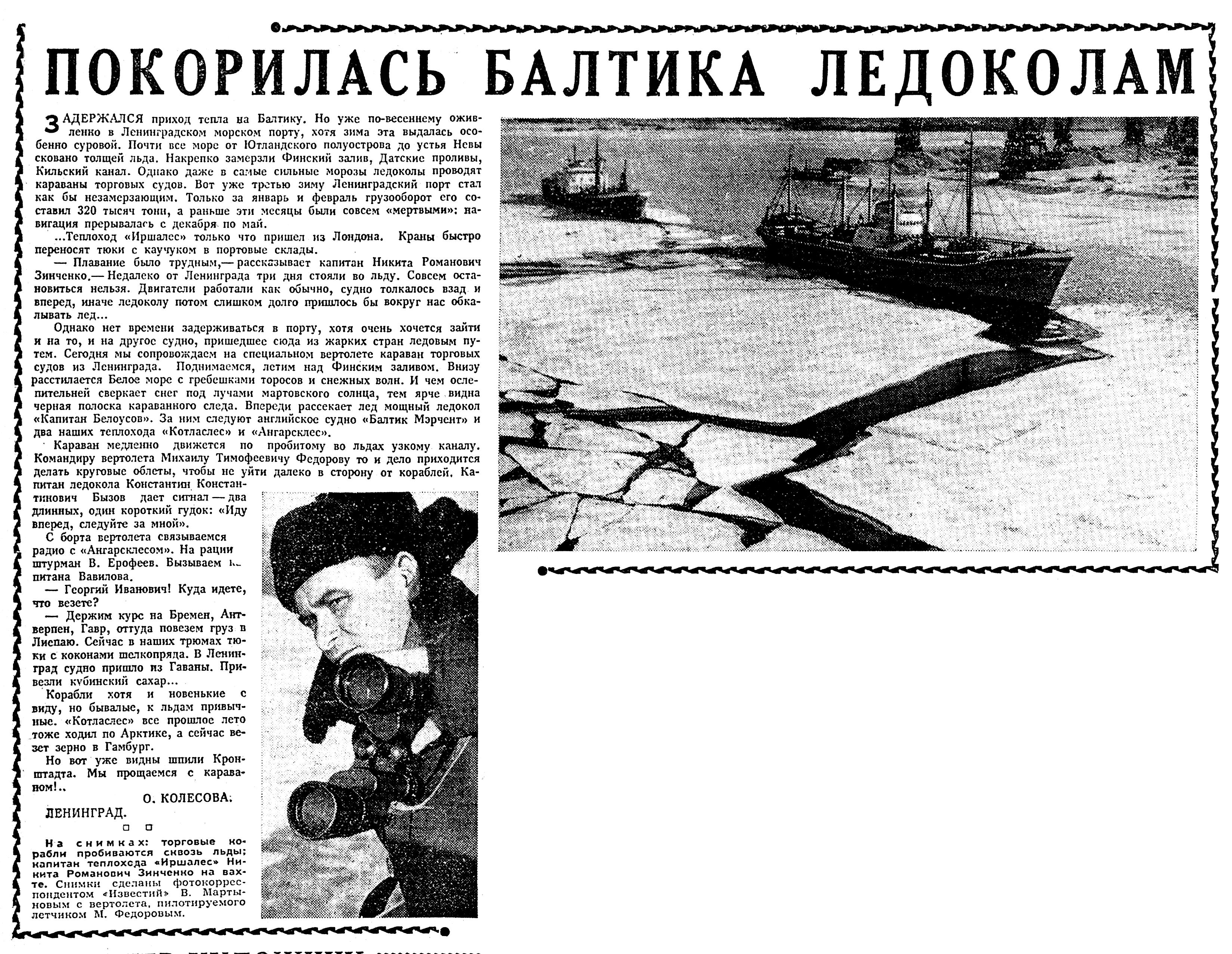 На снимках: торговые корабли пробиваются сквозь льды: капитан теплохода «Иршалес» Никита Романович Зинченко на вахте. Снимки сделаны фотокорреспондентом «Известий» В. Мартыновым с вертолета, пилотируемого летчиком М. Федоровым.