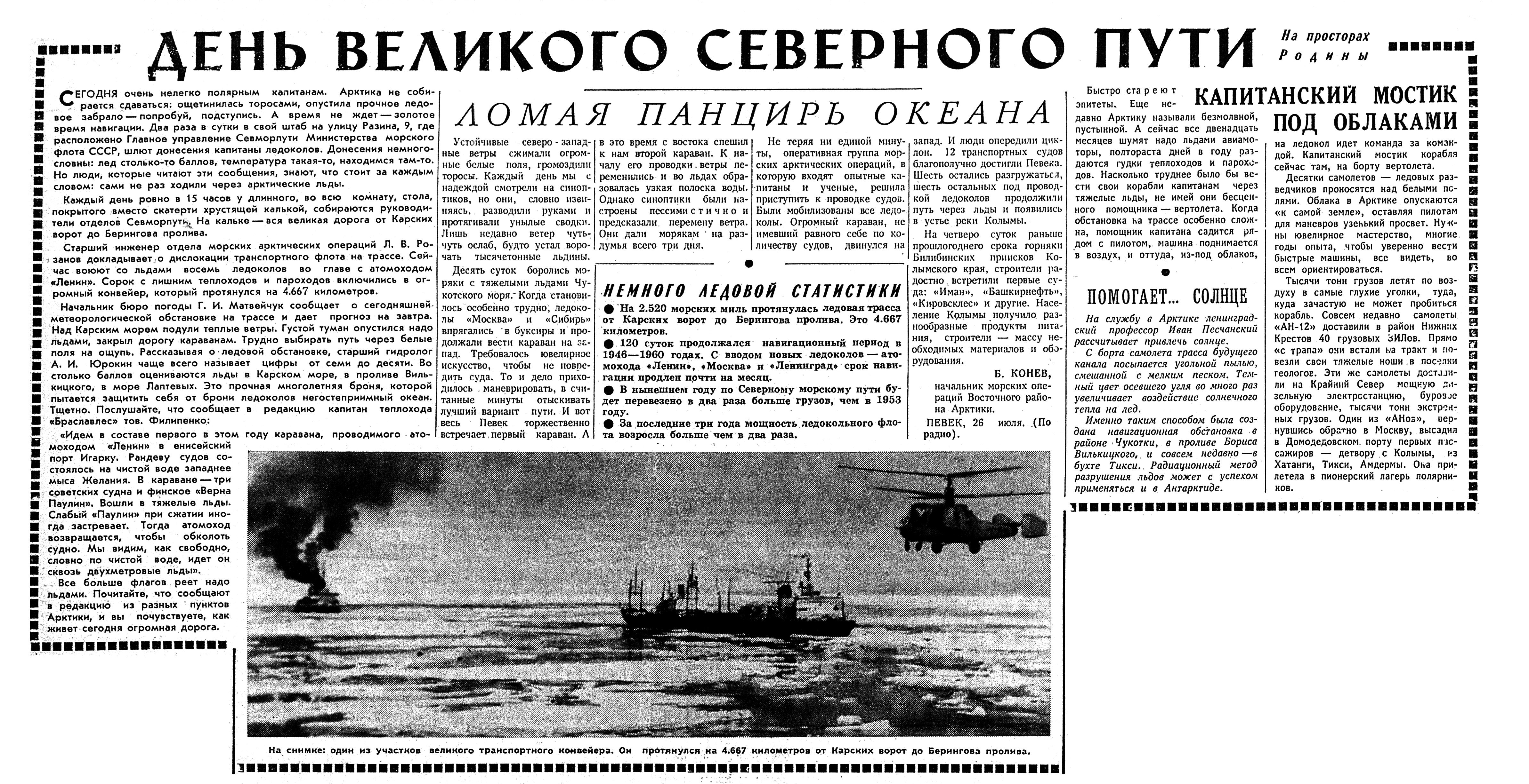 На четверо суток раньше прошлогоднего срока горняки Билибинских приисков Колымского края, строители радостно встретили первые суда: «Иман», «Башкирнефть», «Кировсклес» и другие. Население Колымы получило разнообразные продукты питания, строители — массу необходимых материалов и оборудования.