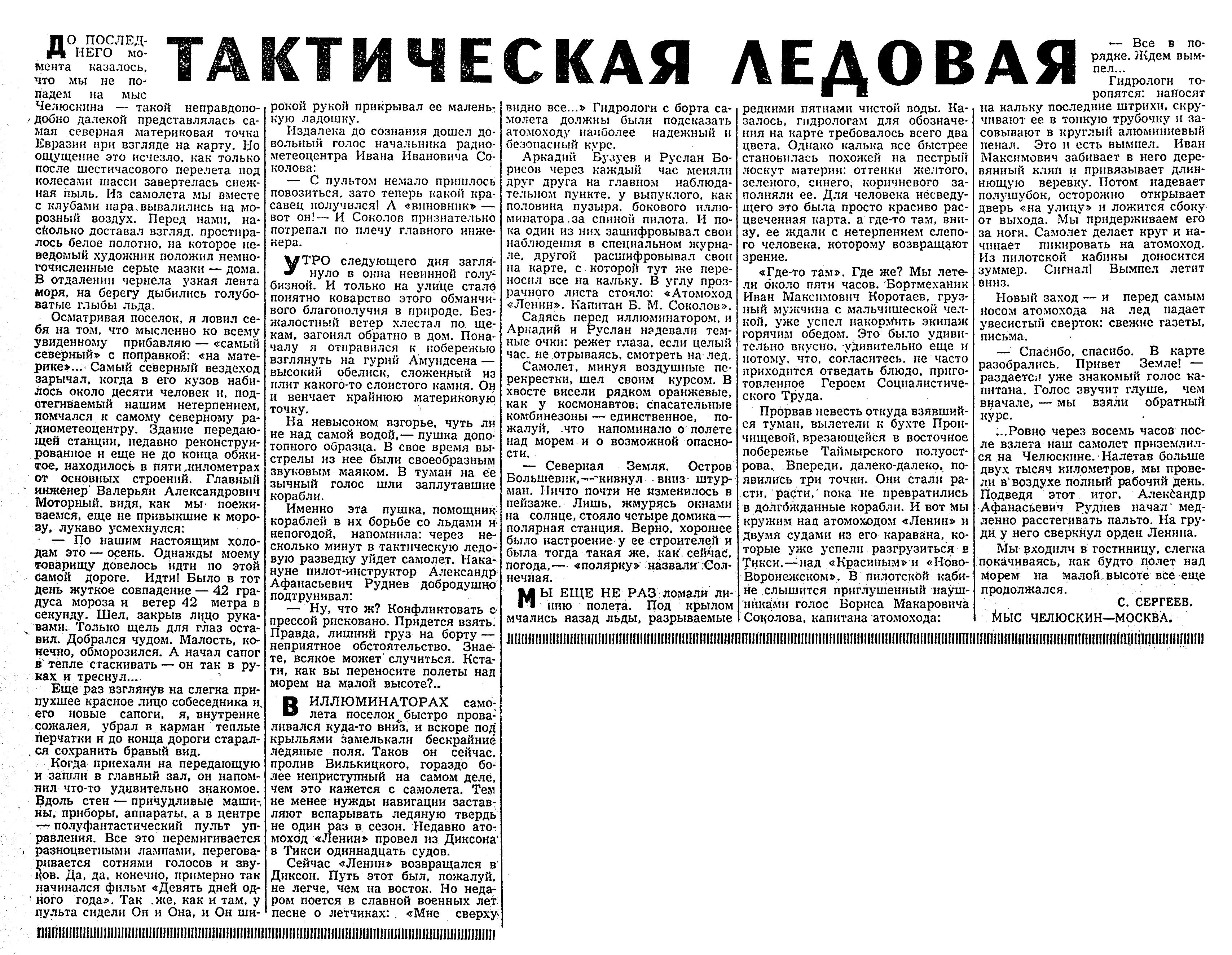 ... Ровно через восемь часов после взлета наш самолет приземлился на Челюскине. Налетав больше двух тысяч километров, мы провели в воздухе полный рабочий день. Подведя этот итог, Александр Афанасьевич Руднев начал медленно расстегивать пальто. На груди у него сверкнул орден Ленина.