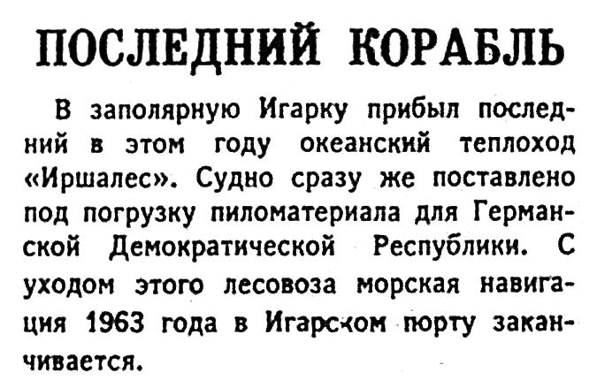 В заполярную Игарку прибыл последний в этом году океанский теплоход «Иршалес». Судно сразу же поставлено под погрузку пиломатериала для Германской Демократической Республики. С уходом этого лесовоза морская навигация 1963 года в Игарском порту заканчивается.