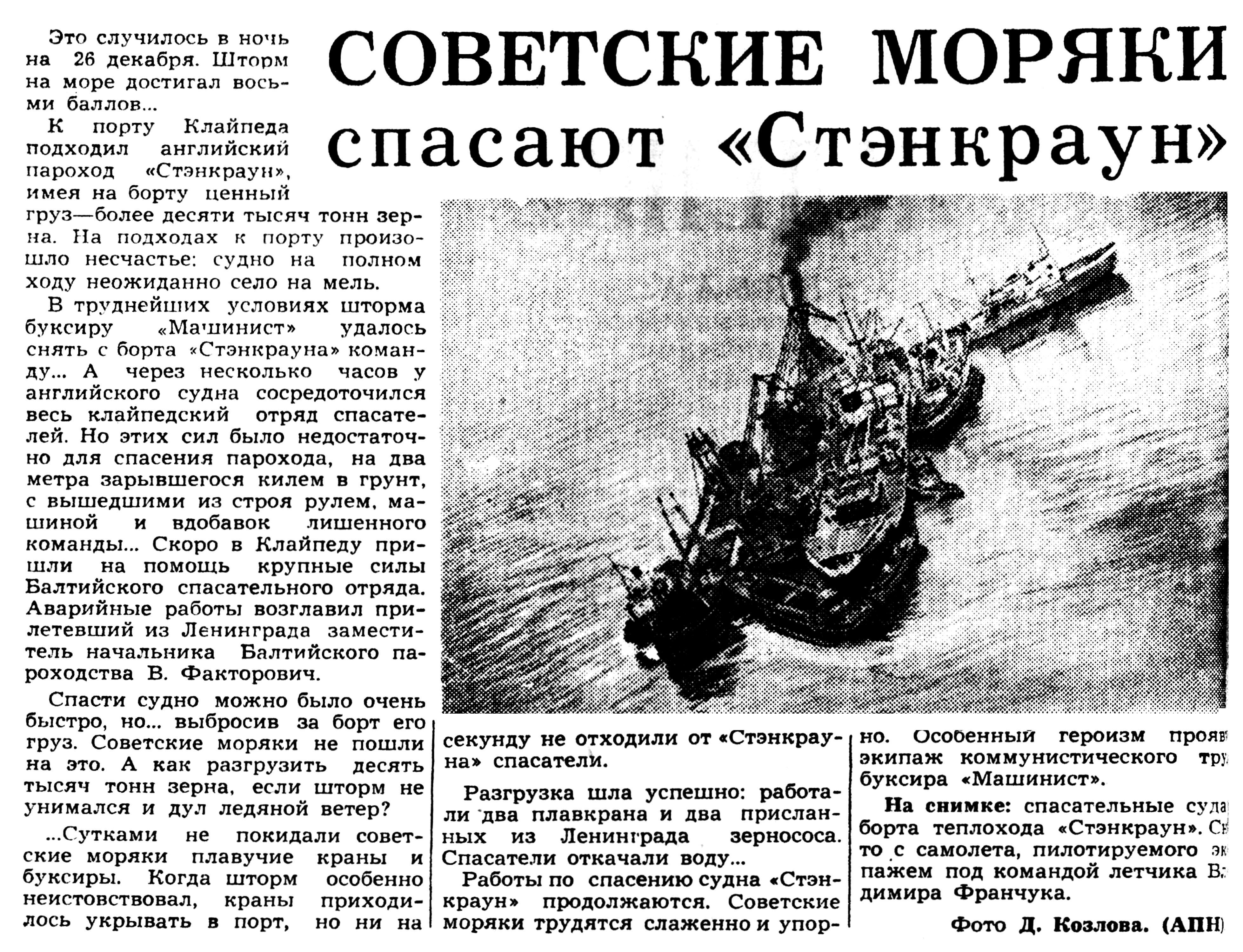 В труднейших условиях шторма буксиру «Машинист» удалось снять с борта «Стэнкрауна» команду... А через несколько часов у английского судна сосредоточился весь клайпедский отряд спасателей. Но этих сил было недостаточно для спасения парохода, на два метра зарывшегося килем в грунт, с вышедшими из строя рулем, машиной и вдобавок лишенного команды... Скоро в Клайпеду пришли на помощь крупные силы Балтийского спасательного отряда. Аварийные работы возглавил прилетевший из Ленинграда заместитель начальника Балтийского пароходства В. Факторович.