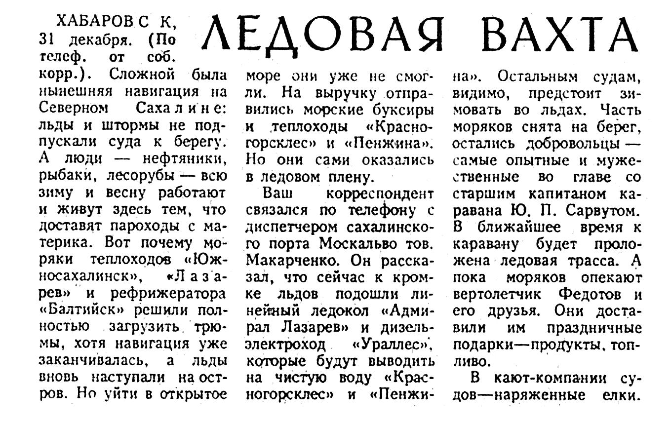 Ваш корреспондент связался по телефону с диспетчером сахалинского порта Москальво тов. Макарченко. Он рассказал, что сейчас к кромке льдов подошли линейный ледокол «Адмирал Лазарев» и дизель-электроход «Ураллес», которые будут выводить на чистую воду «Красногорсклес» и «Пенжина». Остальным судам, видимо, предстоит зимовать во льдах. Часть моряков снята на берег, остались добровольцы — самые опытные и мужественные во главе со старшим капитаном каравана Ю. П. Сарвутом. В ближайшее время к каравану будет проложена ледовая трасса. А пока моряков опекают вертолетчик Федотов и его друзья. Они доставили им праздничные подарки — продукты, топливо.