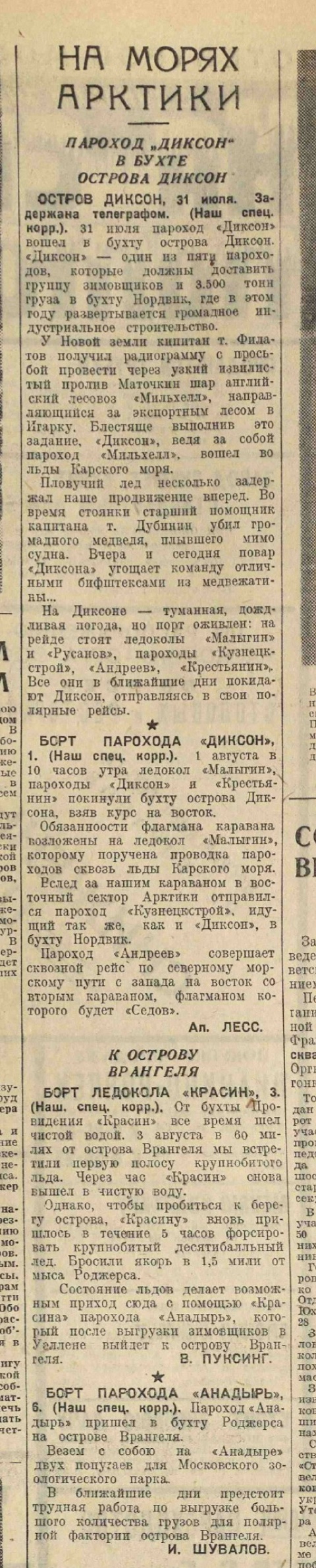 К острову Врангеля пришли краснознаменный ледокол «Красин» и пароход «Анадырь», доставившие новую смену зимовщиков, продовольственные и другие товары. Население острова гостеприимно встретило новую смену, которая уже приступили, к приемке научных работ. Население острова шлет привет красной Москве.