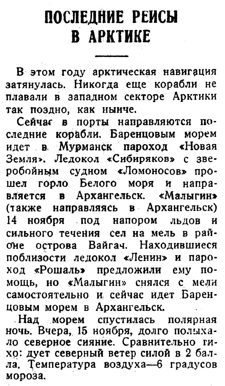 Сейчас в порты направляются последние корабли. Баренцовым морем идет в Мурманск пароход «Новая Земля». Ледокол «Сибиряков» с зверобойным судном «Ломоносов» прошел горло Белого моря и направляется в Архангельск. «Малыгин» (также направляясь в Архангельск) 14 ноября. под напором льдов и сильного течения сел на мель в районе острова Вайгач. Находившиеся поблизости ледокол «Ленин» и пароход «Рошаль» предложили ему помощь, но «Малыгин» снялся с мели самостоятельно и сейчас идет Баренцовым морем в Архангельск.
