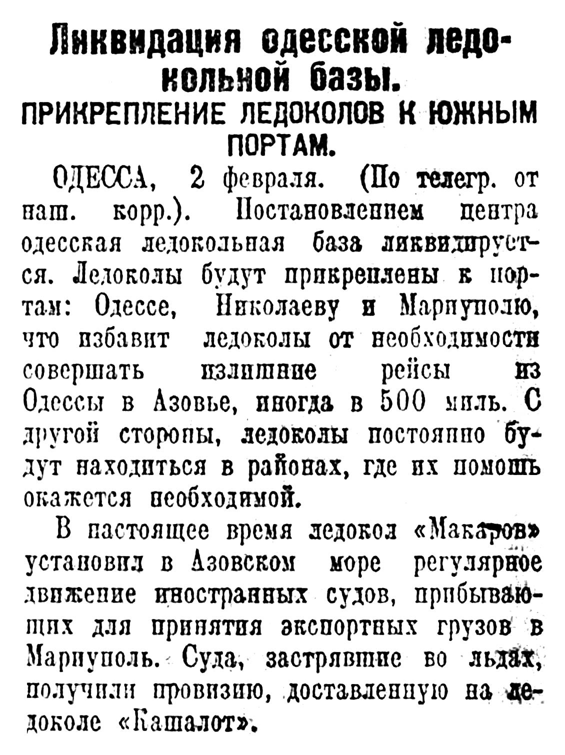 «Макаров» приступил к проводке судов, застрявших во льдах в Керченском проливе. Сегодня выведены в Черное море, пароходы «Тасос» и «Роверет», груженные зерном. Вслед за этим «Макаров» начал проводить в Мариуполь три судна из направляющихся туда шести.