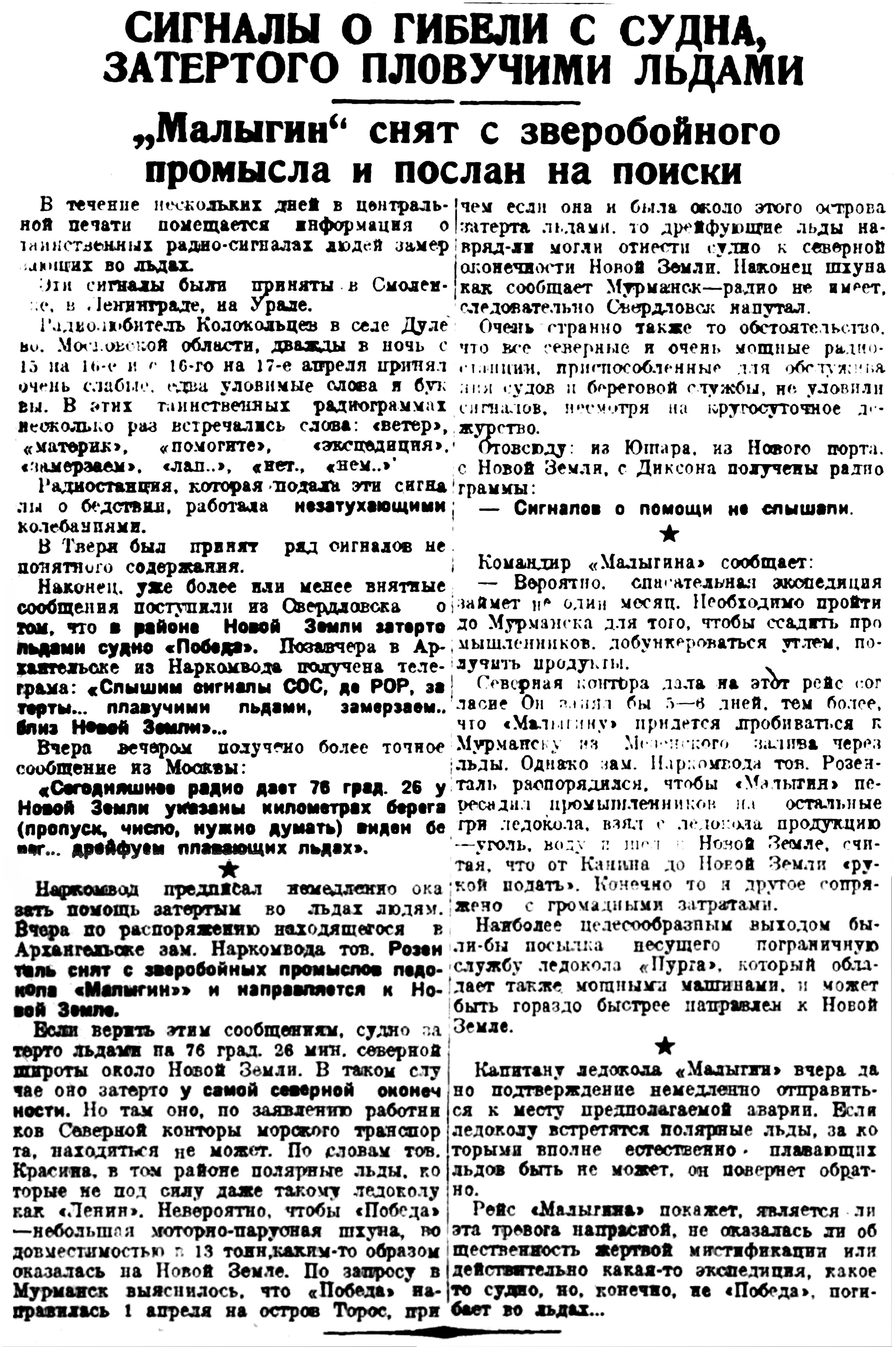 Наркомвод предписал немедленно оказать помощь затертым во льдах людям. Вчера по распоряжению находящегося в Архангельске зам. Наркомвода тов. Розенталь снят с зверобойных промыслов ледокол «Малыгин»» и направляется к Новой Земле.