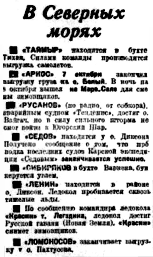 ■ По сообщению командира ледокола "Красин" т. Легздина, ледокол достиг Русской гавани (Новая Земля). "Красин" снимет зимовщиков.