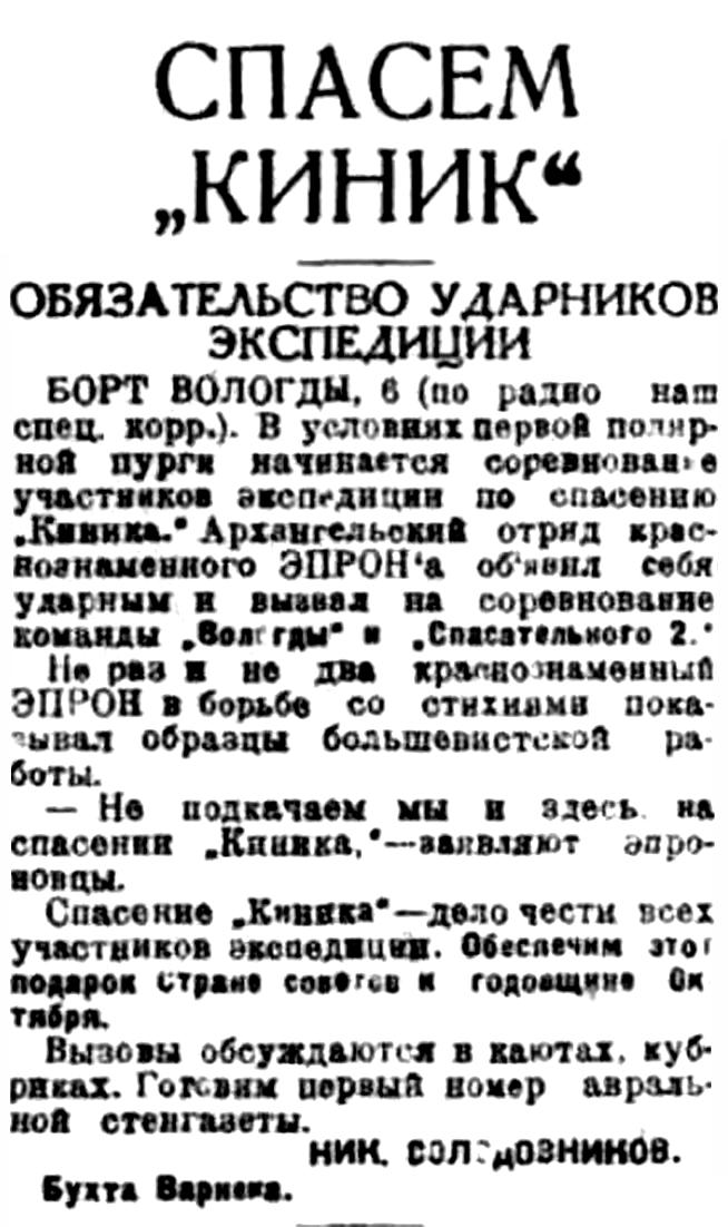 Спасение "Киника" — дело чести всех участников экспедиции. Обеспечим этот подарок стране советов к годовщине Октября.