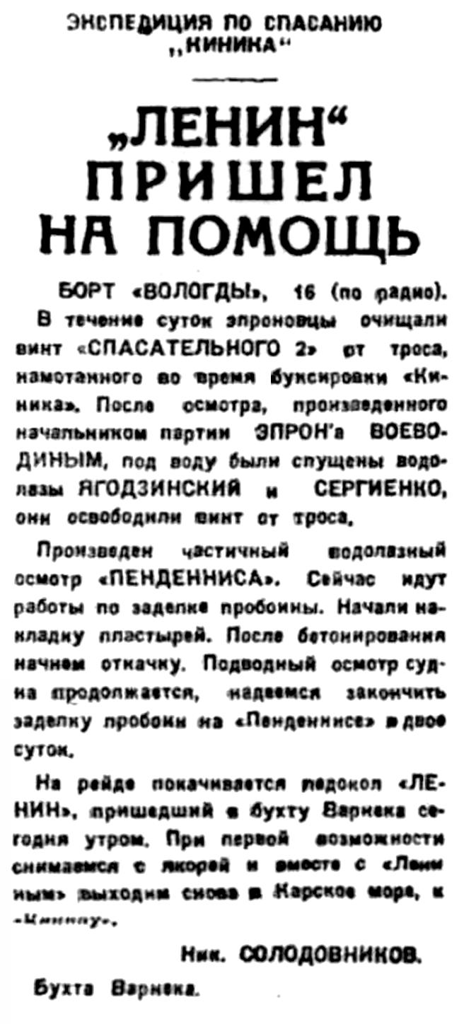 Вчера днем получено радио с места аварии "Киника". Весь груз с носовой и кормовой части сброшен в море. "Киник" получил набольшую пловучесть, но середина судна продолжала держаться на каменном днище. Во время крупной зыби "ВОЛОГДА" и "СПАСАТЕЛЬНЫЙ № 2" пытались буксировать "Киника". Судно имело некоторое движение, но затем ветром и зыбью оно было вновь заброшено на мель. Ветер настолько усилился, что волной стало закидывать верхнюю палубу и надстройки. Люди, находившиеся на борту "Киника", были во-время сняты и доставлены в бухту Варнека. Руководство спасательными работами "Киника" предполагает после того, как стихнет шторм, с помощью пришедшего в бухту Варнека ледокола "Ленин" снять судно с мели.