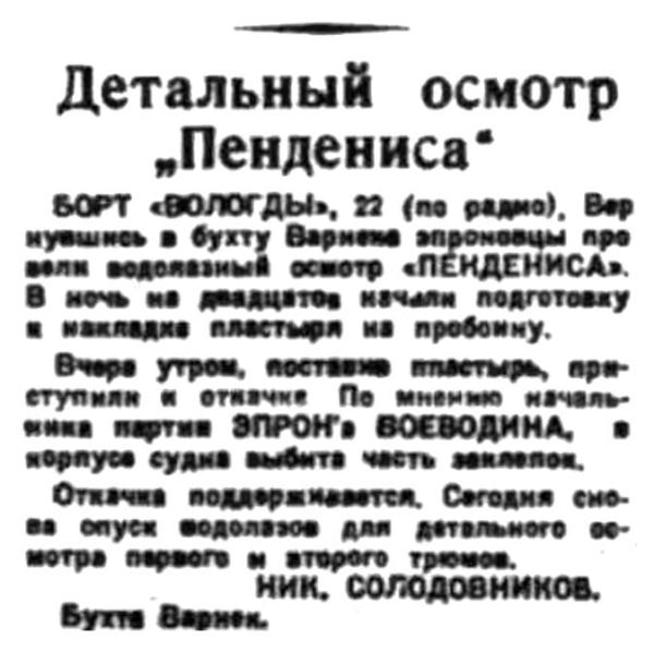 БОРТ "ВОЛОГДЫ", 22 (по радио). Вернувшись в бухту Варнека эпроновцы провели водолазный осмотр "ПЕНДЕНИСА". В ночь на двадцатое начали подготовку к накладке пластыря на пробоину.