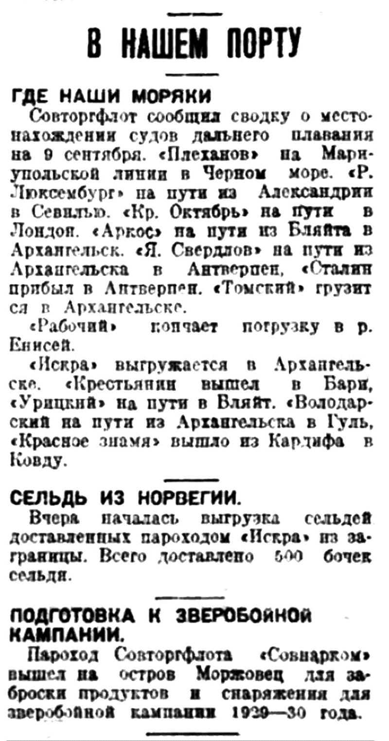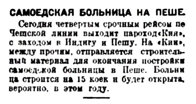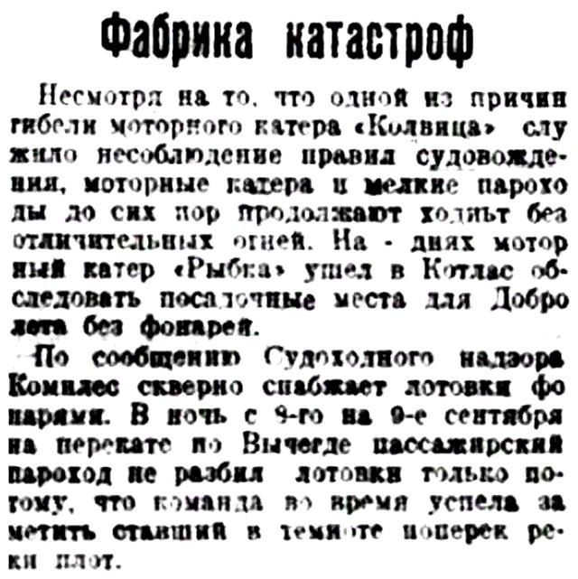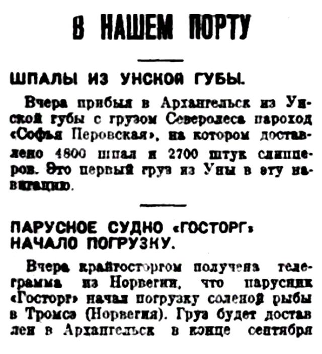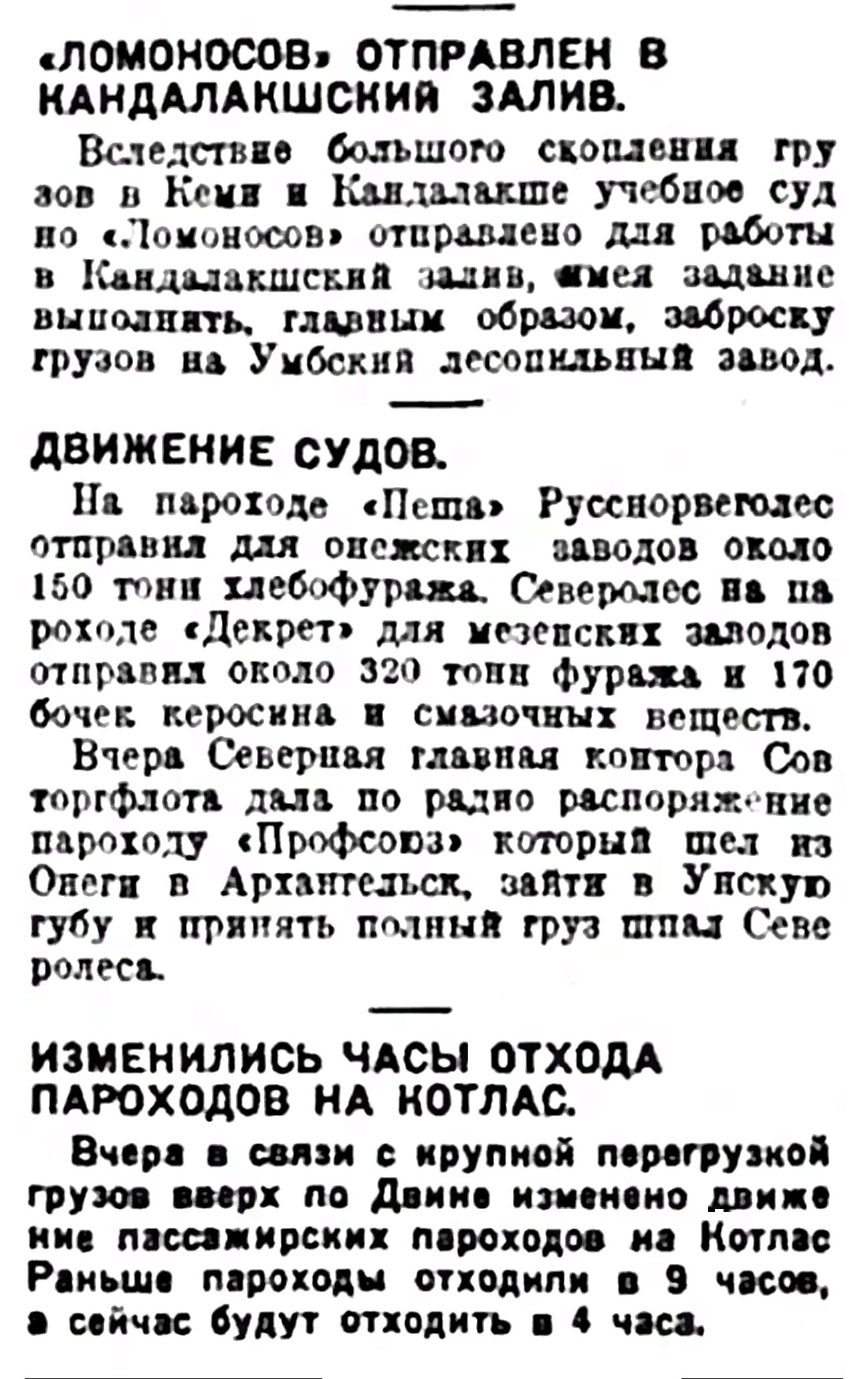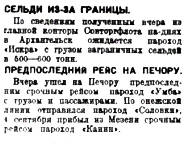 Срочные рейсы па Печору окончены 16 сентября и в настоящее время туда отправляются только лишь грузовики и сверхсрочные пароходы.