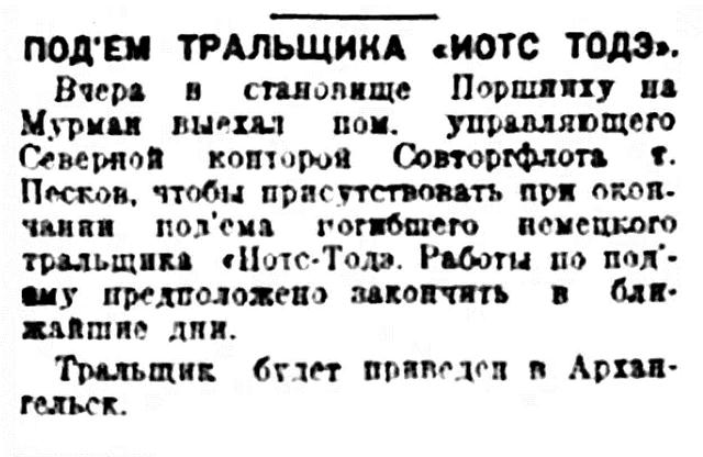 Приводится переброска грузов на склады правого берега, на Смольный Буян, куда вероятно будет заброшено около 100 тысяч пудов. На днях снова ожидается массовое прибытие грузов, о чем Совторгфлот получил телеграфное извещение.
