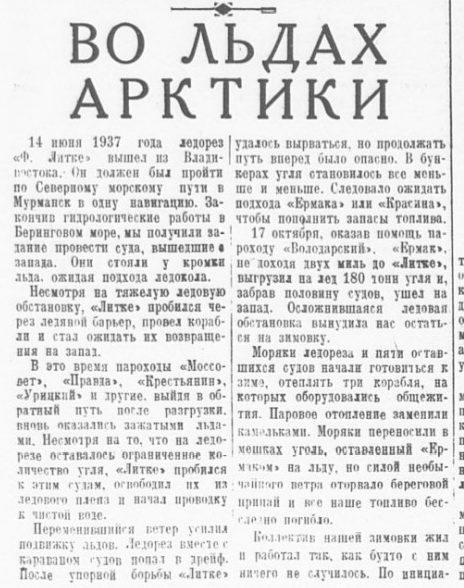 В беседе с вашим корреспондентом командир корабля тов. Вершинский рассказал о труднейшем северном походе, совершенном экипажем судна.