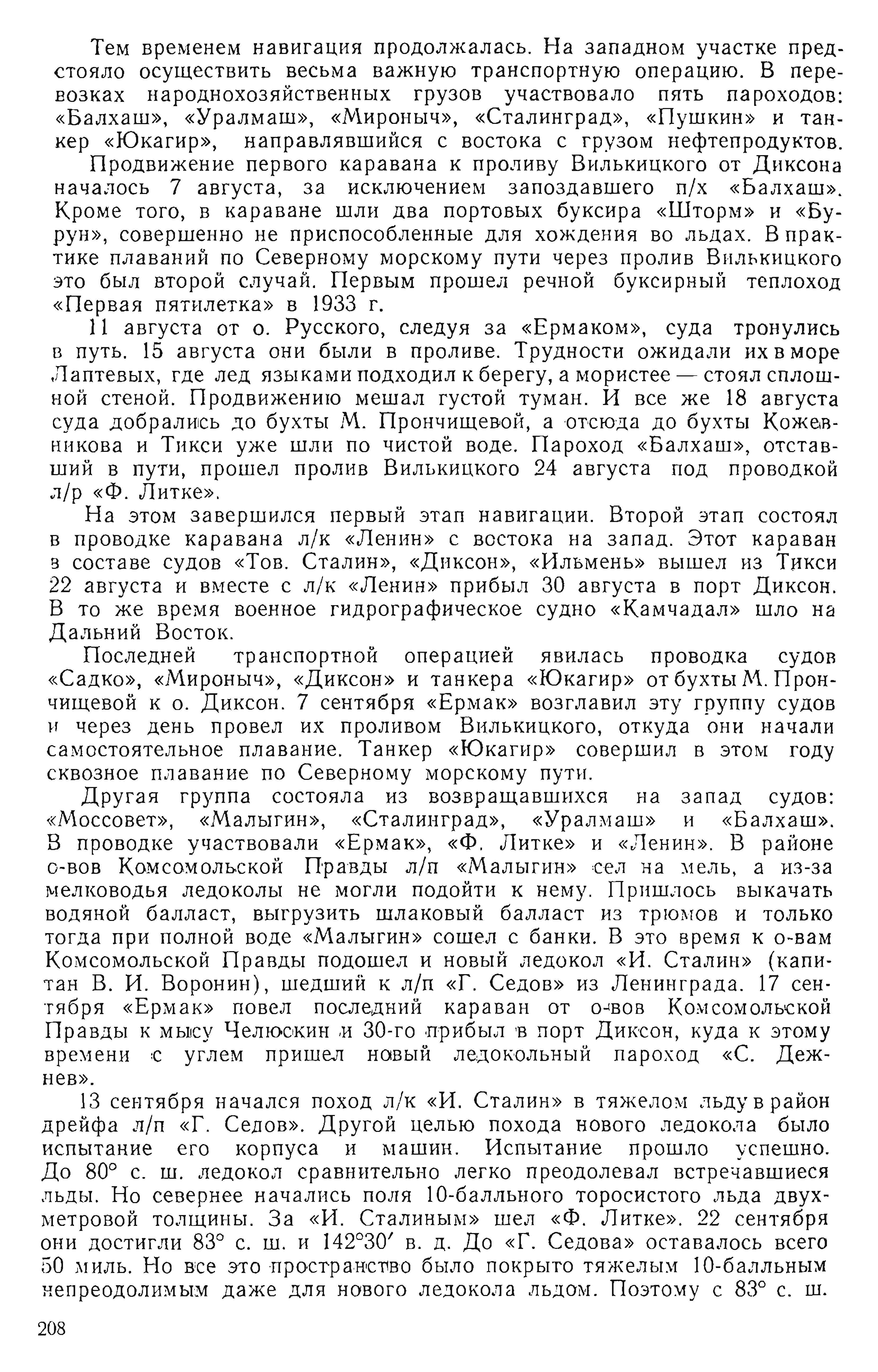 Значительным событием навигации явилось вступление в строй нового линейного ледокола «И. Сталин» (водоизмещение 9000 т, мощность главных машин 10 000 л. с., скорость—14,5 узла, паровые машины, запас топлива — 1800 т) {1}. Из-за опоздания этот ледокол принял участие только в .конце навигации, но уже в первые дни работы показал, что советский ледокольный флот получил большое подкрепление. В 1938 г. вошел в строй судов ледового плавания л/п «С. Дежнев» водоизмещением 6530 т, мощность — 2500 л. с., скорость—11,5 узла, чистая грузоподъемность — 2140 т. {2}. Это были два первых советских судна ледового плавания. В 1939—1941 гг. в строй вступили еще три таких ледокола и один ледокольный пароход типа «С. Дежнев». Все это коренным образом улучшало возможности успешного плавания по Северному морскому пути.