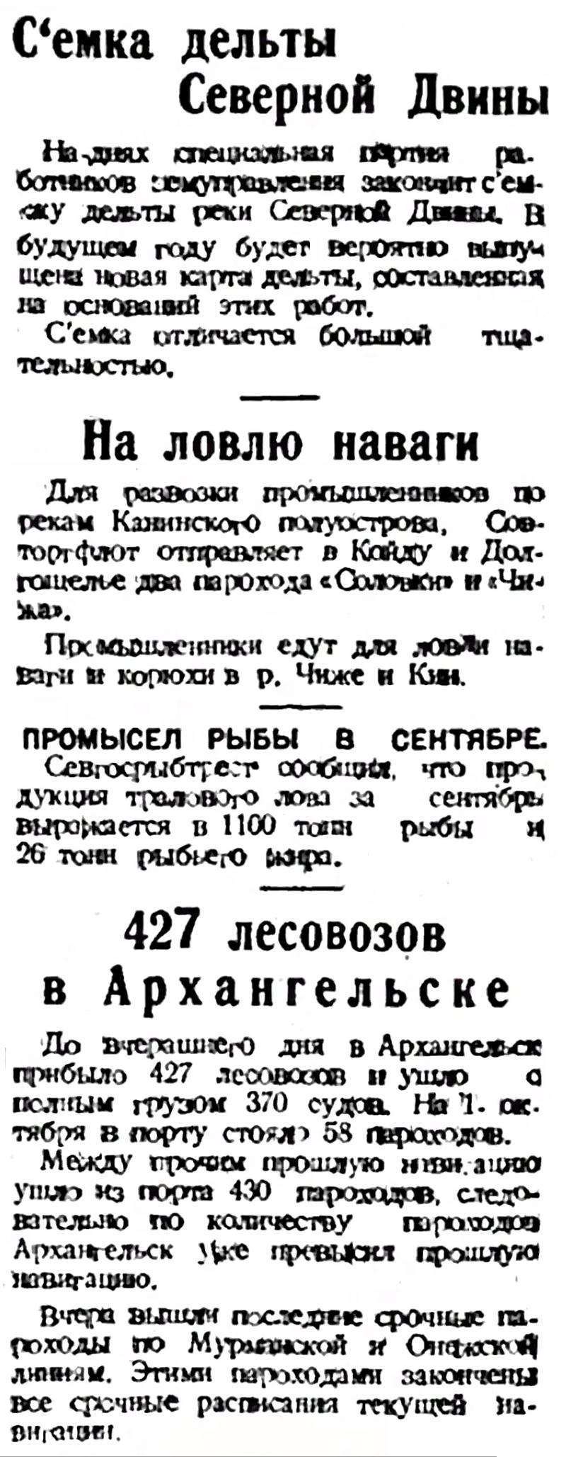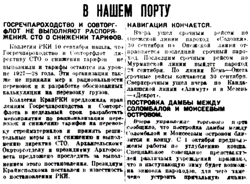 Вчера ушел срочным рейсом по Онежской линии пароход "Соловки". 30 сентября по Онежской линии отправляется последний срочный пароход. Последним срочным рейсом по Мурманской линии выйдет пароход 28 сентября. По линии Кемь — Онега срочные рейсы кончаются 30 сентября. Сверхсрочным ушел вчера по Кандалакшской линии "Азимут" и в Мезень — "Декрет".