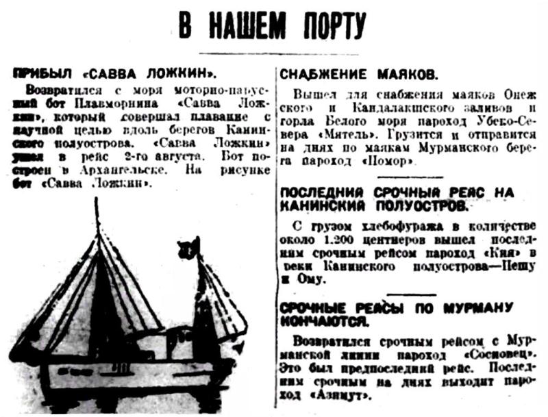 Вчера вышла в Мезень "Софья Перовская" с полным грузом хлебофуража и керосина. Вышли на промысел тральщики Севгосрыбтреста № 42 «Пинагор», № 40 "Скат", № 31 - "Налим" и № 32 "Кумжа".