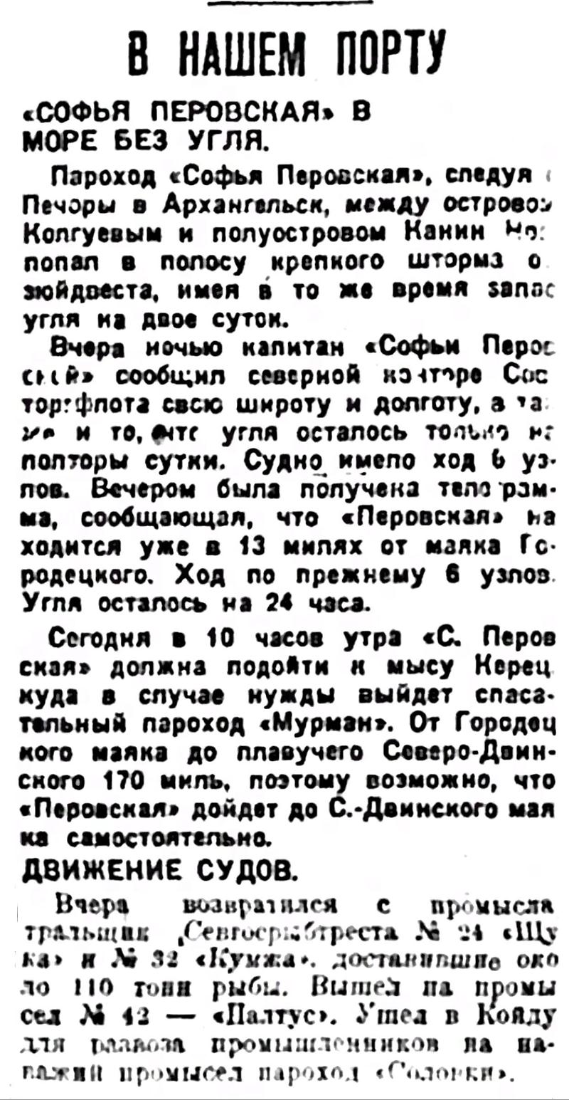"Правда Севера" своевременно сообщала о том, что пароход, "С. Перовская", следуя с Печоры в Архангельск, около острова Колгуева попал в полосу крепкого шторма, имея запас угля только лишь на двое суток.