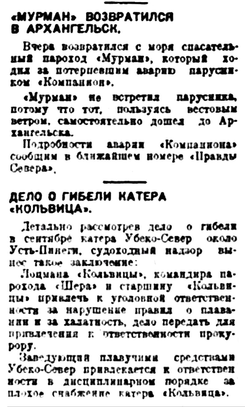 Вчера возвратился с моря спасательный пароход "Мурман", который ходил за потерпевшим аварию парусником "Компанион". "Мурман" не встретил парусника, потому что тот, пользуясь вестовым ветром, самостоятельно дошел до Архангельска. Подробности аварии "Компаниона" сообщим в ближайшем номере "Правды Севера".