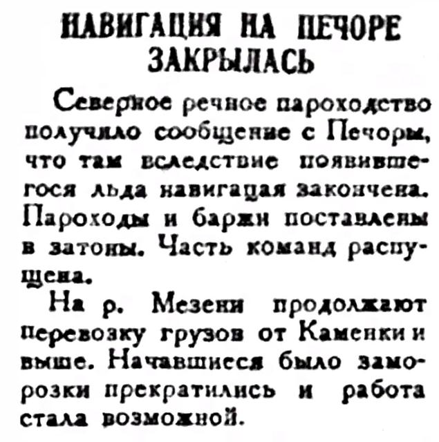 Вышел в Мезень несрочным рейсом пароход "Сосновец" и на рыбный промысел тральщики Севгосрыбтреста № 24 "Щука" и № 28 "Камбала". Барк "Альбатрос" кончает погрузку.