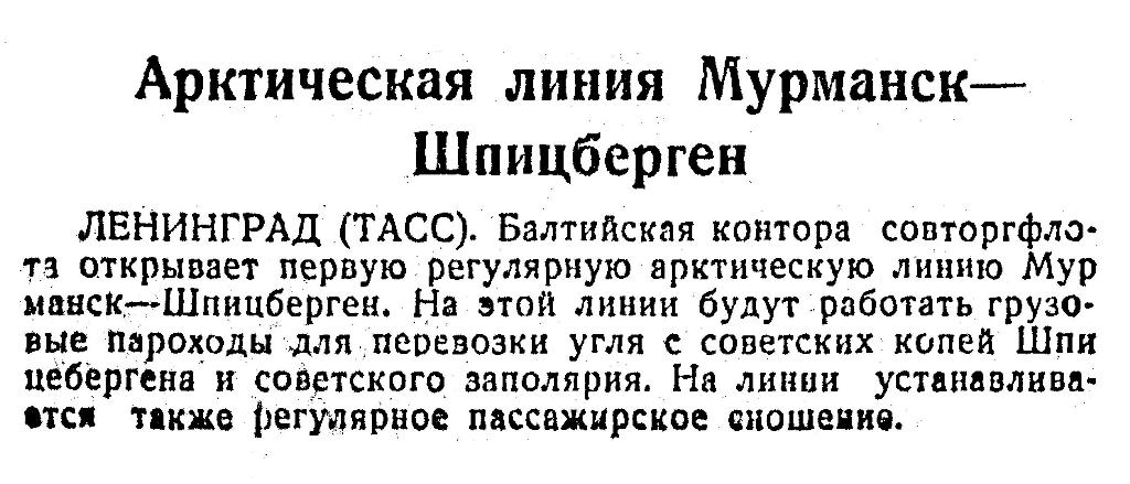 ЛЕНИНГРАД (ТАСС). Балтийская контора Совторгфлота открывает первую регулярную арктическую линию Мурманск — Шпицберген. На этой линии будут работать грузовые пароходы для перевозки угля с советских копей Шпицбергена и советского заполярия. На линии устанавливается также регулярное пассажирское сношение.