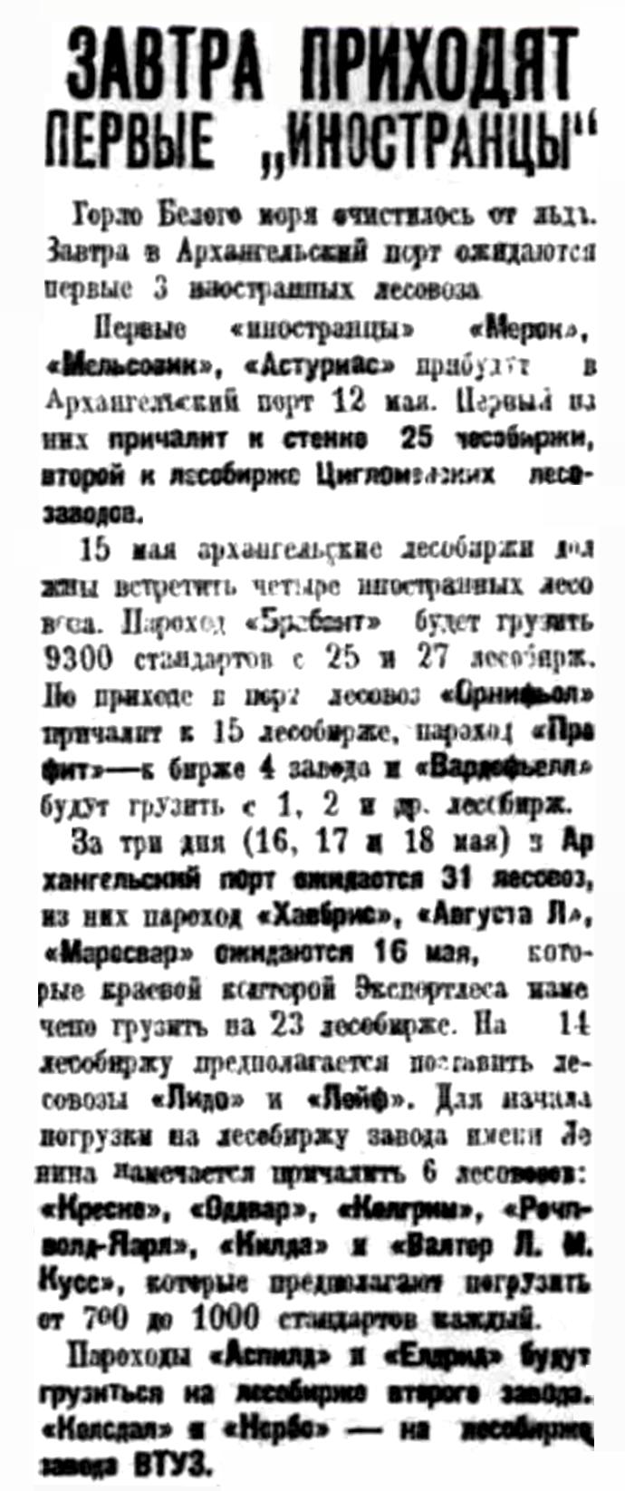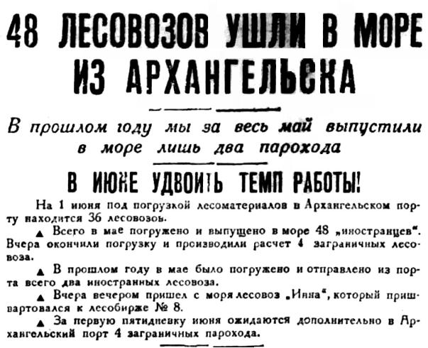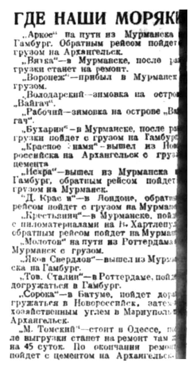 Прибыл один пароход. Два парохода, закончив погрузку, ушли из порта. Таким образом в порту остаюсь 11 транспортов, из которых 7 стоят под выгрузкой, 3 под погрузкой и 1 на рейде.