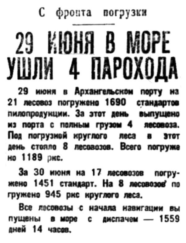 Разгружено из пароходов в вагоны прямого сообщения 259 тонн генгруза и на пристань -1026 тонн, погружено в пароходы 1100 тонн.