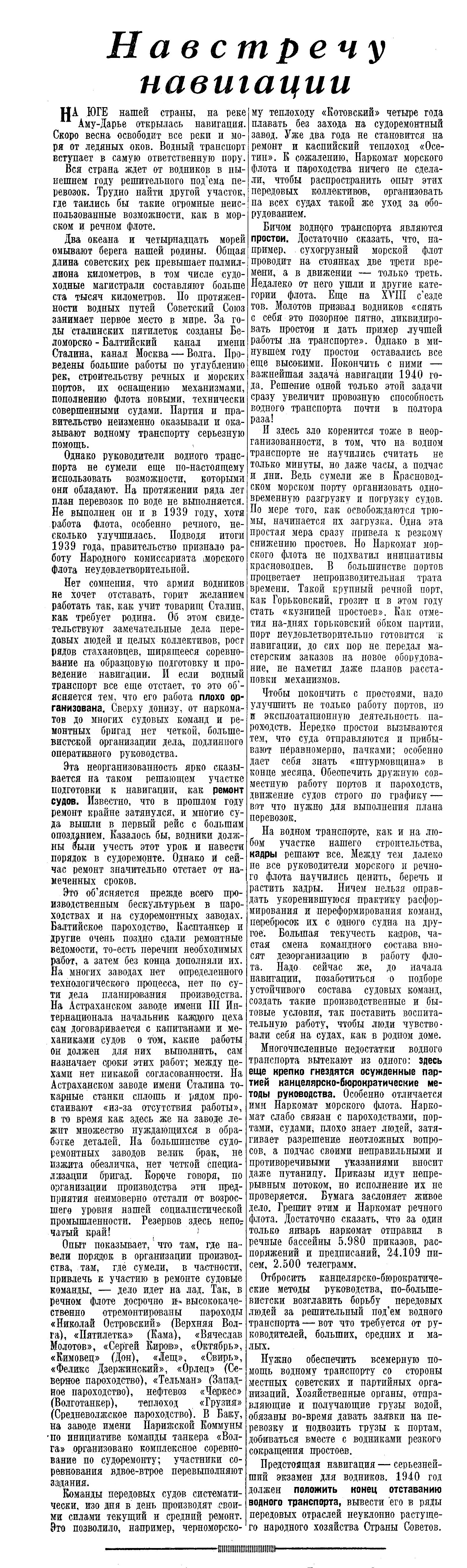 Предстоящая навигация — серьезнейший экзамен для водников. 1940 год должен положить конец отставанию водного транспорта, вывести его в ряды передовых отраслей неуклонно растущего народного хозяйства Страны Советов.