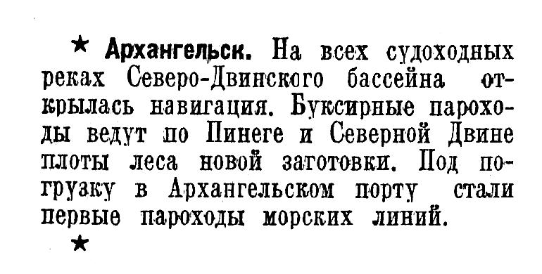 Архангельск. На всех судоходных реках Северо-Двинского бассейна открылась навигация. Буксирные пароходы ведут по Пинеге и Северной Двине плоты леса новой заготовки. Под погрузку в Архангельском порту стали первые пароходы морских линий.