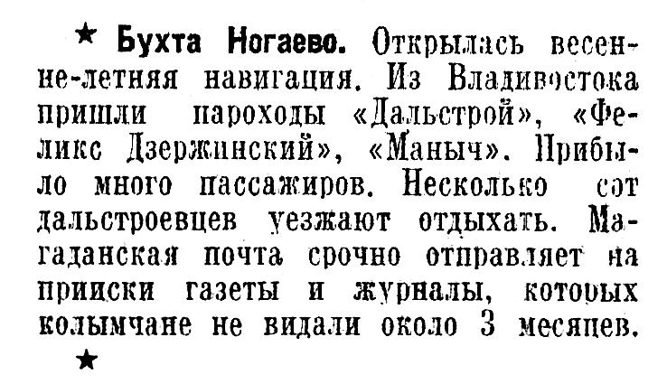 Бухта Ногаево. Открылась весенне-летняя навигация. Из Владивостока пришли пароходы «Дальстрой», «Феликс Дзержинский», «Маныч». Прибыло много пассажиров. Несколько сот дальстроевцев уезжают отдыхать. Магаданская почта срочно отправляет на прииски газеты и журналы, которых колымчане не видали около 3 месяцев.