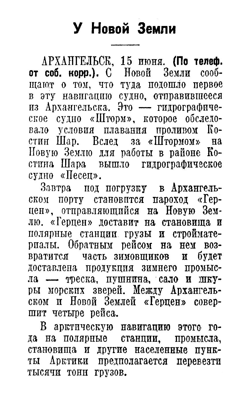 Завтра под погрузку в Архангельском порту становится пароход «Герцен», отправляющийся на Новую Землю. «Герцен» доставит на становища и полярные станции грузы и стройматериалы. Обратным рейсом на нем возвратится часть зимовщиков и будет доставлена продукция зимнего промысла — треска, пушнина, сало и шкуры морских зверей. Между Архангельском и Новой Землей «Герцен» совершит четыре рейса.