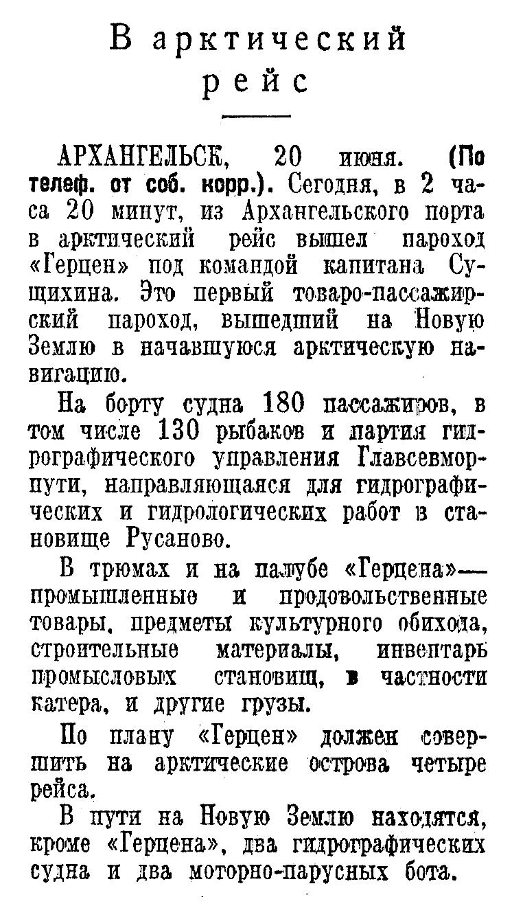 АРХАНГЕЛЬСК, 20 июня. (По телеф. от соб. корр.). Сегодня, в 2 часа 20 минут, из Архангельского порта в арктический рейс вышел пароход «Герцен» под командой капитана Сущихина. Это первый товаро-пассажирский пароход, вышедший на Новую Землю в начавшуюся арктическую навигацию.