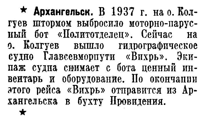 Архангельск. В 1937 г. на о. Колгуев штормом выбросило моторно-парусный бот «Политотделец». Сейчас на о. Колгуев вышло гидрографическое судно Главсевморпути «Вихрь». Экипаж судна снимает с бота ценный инвентарь и оборудование. По окончании этого рейса «Вихрь» отправится из Архангельска в бухту Провидения.