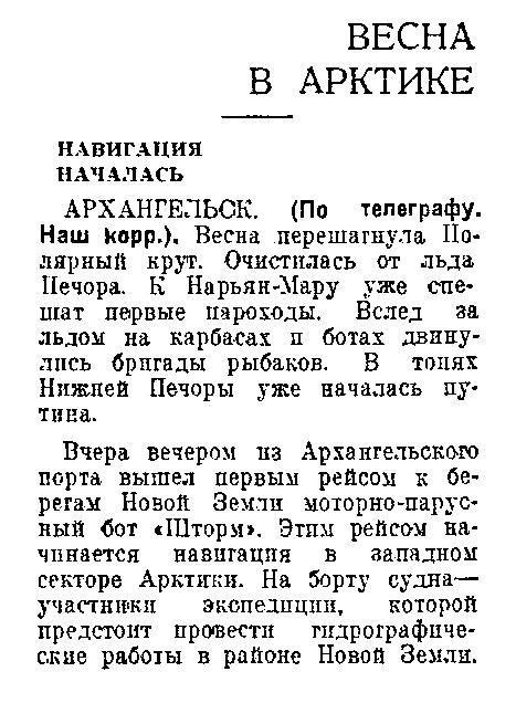 В Мурманском я Архангельском портах — большое оживление. Арктические корабли завершают подготовку к навигации и в ближайшие дни начнут выходить в море. Закончил погрузку находящийся в Архангельске ледокольный пароход «Сибиряков». По полученным сведениям, сегодня он станет на рейд. «Сибиряков» совершит большой рейс в Арктику и будет буксировать суда на Енисее. Грузятся также пароходы «Сакко» и «Диксон». Они выйдут на-днях в море и возьмут курс к бухте Тикси.