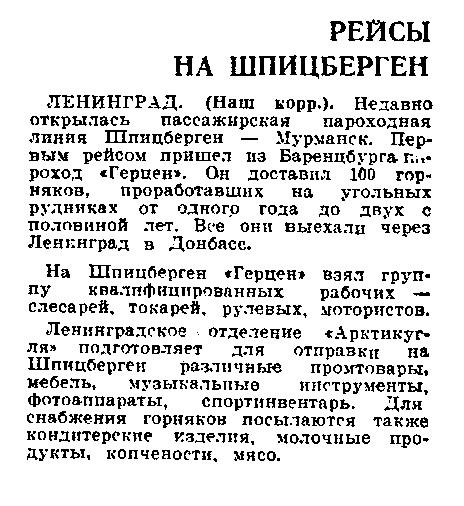 ЛЕНИНГРАД. (Наш корр.). Недавно открылась пассажирская пароходная линия Шпицберген — Мурманск. Первым рейсом пришел из Баренцбурга пароход «Герцен». Он доставил 100 горняков, проработавших на угольных рудниках от одного года до двух с половиной лет. Все они выехали через Ленинград в Донбасс.
