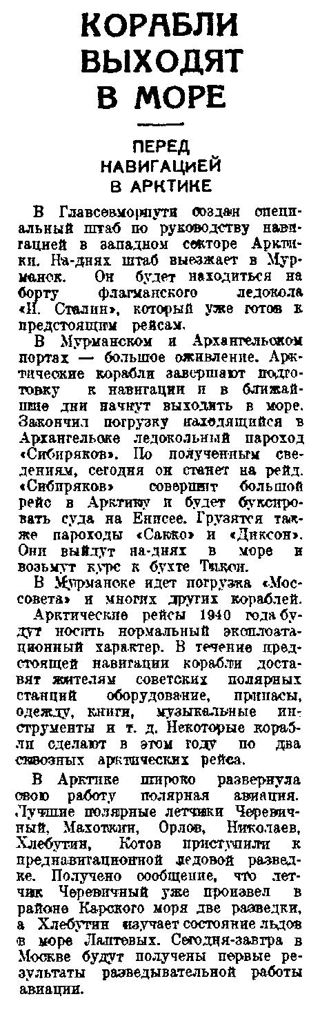 Арктические рейсы 1940 года будут носить нормальный эксплуатационный характер. В течение предстоящей навигации корабли доставят жителям советских полярных станций оборудование, припасы, одежду, книги, музыкальные инструменты и т. д. Некоторые корабли сделают в этом году по два сквозных арктических рейса.