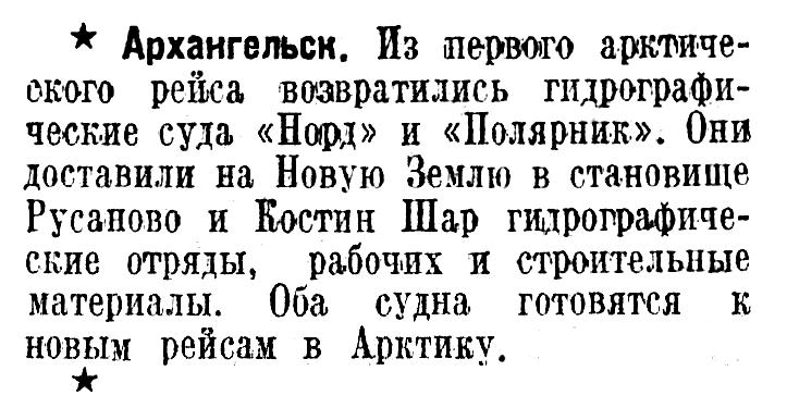 Архангельск. Из первого арктического рейса возвратились гидрографические суда «Норд» и «Полярник». Они доставили на Новую Землю в становище Русаново и Костин Шар гидрографические отряды, рабочих и строительные материалы. Оба судна готовятся к новым рейсам в Арктику.