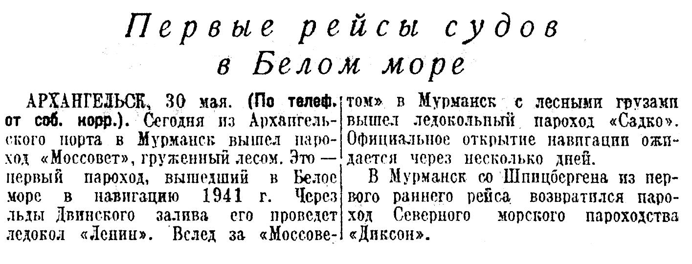 Навигация 1941 г. на западеКогда началась война, подготовка к навигации развертывалась вовсю. С началом боевых действий пришлось пересмотреть план грузоперевозок и расстановку судов. В первый день войны на чрезвычайном заседании коллегии Главсевморпути состоялся обмен мнениями о дальнейшей судьбе арктической навигации {2}. В связи с мобилизацией ряда судов и передачей некоторых единиц ледокольного флота военном командованию, состав транспортов и грузов, предназначенных в Арктику, изменился. Из Архангельска в Арктику отправились предусмотренные планом 16 судов, в их числе пароходы «Пинега», «Сакко», «Мироныч», «Сталинград», «Кара», «Кузнец Лесов», «Революционер», «Аркос», «Правда», «Двиналес», «Узбекистан», «Крестьянин» и др. Пароходам «Пинега», «Узбекистан», «Щорс», т/х «Клара Цеткин» надлежало доставить в Дудинку Мончегорский никелевый завод. Значительное место занял завоз продовольствия и топлива из расчета двухлетнего обеспечения полярных станций и северных портов. Три судна совершили двойной рейс между Диксоном и Яной, Архангельском, бухтой Кожевникова, а также на полярные станции, расположенные в бассейне Карского моря и на Новой Земле.