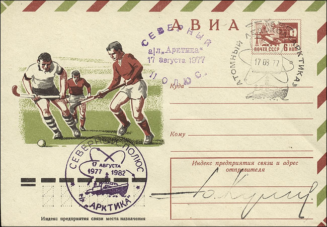 Разговор о глубинах зашел сегодня и с человеком, который по роду своей работы не имеет никакого отношения к гидрографии, — с техником-лаборантом Рафаилом Булатовым. Он изготовил на куске резины, а Кучиев утвердил штемпель с надписью: «Северный полюс, атомный ледокол «Арктика», 17 августа 1977 года», и вот уже второй день этим знаком помечаются конверты, открытки, фотографии, географические карты.