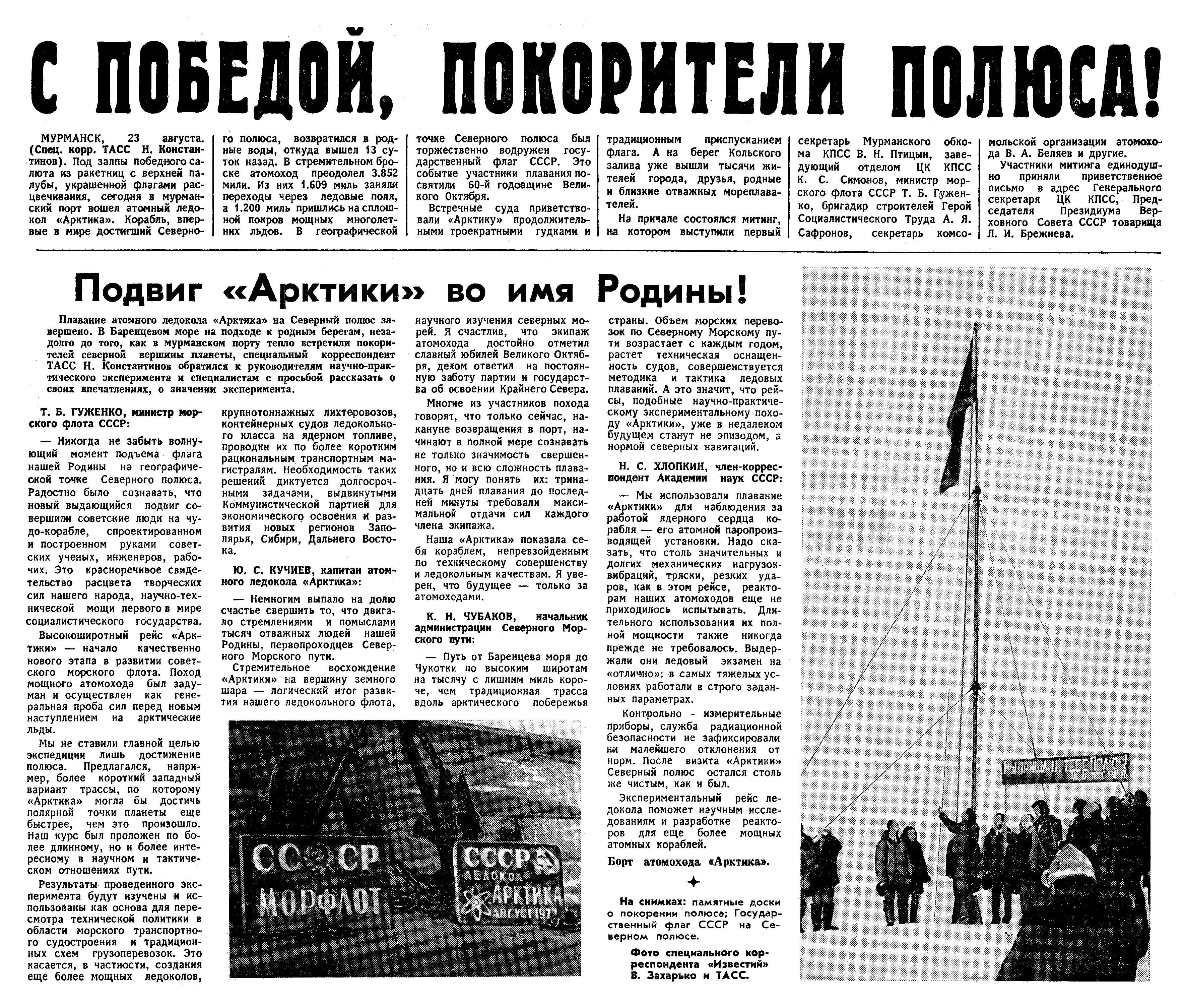 Выражая чувства сыновней благодарности родной Коммунистической партии и Советскому правительству за высокую оценку нашего труда, мы, Леонид Ильич, прекрасно понимаем, что все свершенное нами стало возможным благодаря постоянной заботе партии и правительства о расцвете науки, техники, коммунистическом воспитании советских людей — людей труда, патриотов своей Родины, интернационалистов. Пробиваясь через тяжелые льды, атомный ледокол «Арктика» держит курс в порт приписки, Мурманск. После короткого отдыха мы снова выйдем на трассу Северного Морского пути — нашу национальную транспортную магистраль для проводки судов с народнохозяйственными грузами.