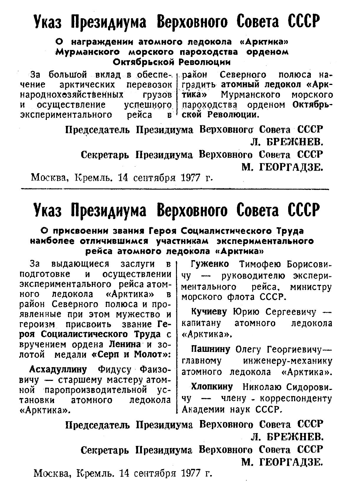 район Северного полюса наградить атомный ледокол «Арктика» Мурманского морского пароходства орденом Октябрьской Революции.