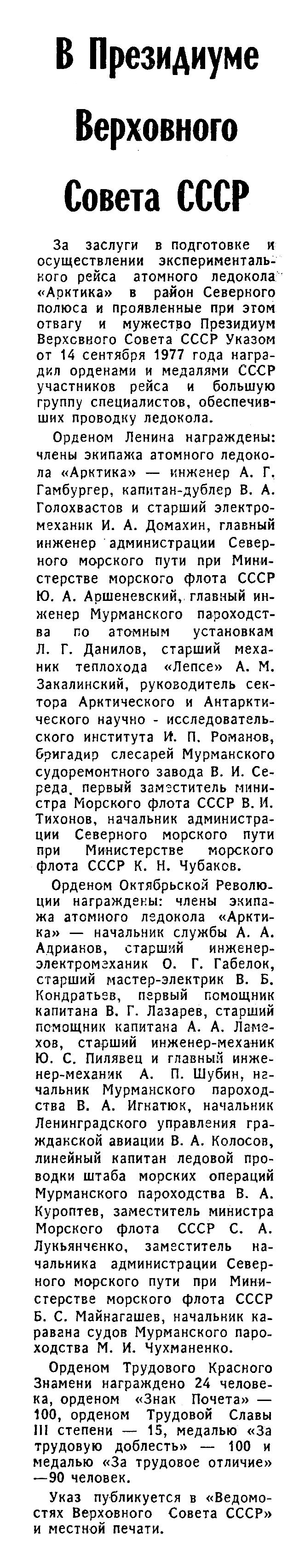 Орденом Ленина награждены: члены экипажа атомного ледокола «Арктика» — инженер А. Г. Гамбургер, капитан-дублер В. А. Голохвастов и старший электромеханик И. А. Домахин, главный инженер администрации Северного морского пути при Министерстве морского флота СССР Ю. А. Аршеневский, главный инженер Мурманского пароходства по атомным установкам Л. Г. Данилов, старший механик теплохода «Лепсе» А. М. Закалинский, руководитель сектора Арктического и Антарктического научно - исследовательского института И. П. Романов, бригадир слесарей Мурманского судоремонтного завода В. И. Середа, первый заместитель министра Морского флота СССР В. И. Тихонов, начальник администрации Северного морского пути при Министерстве морского флота СССР К. Н. Чубаков.