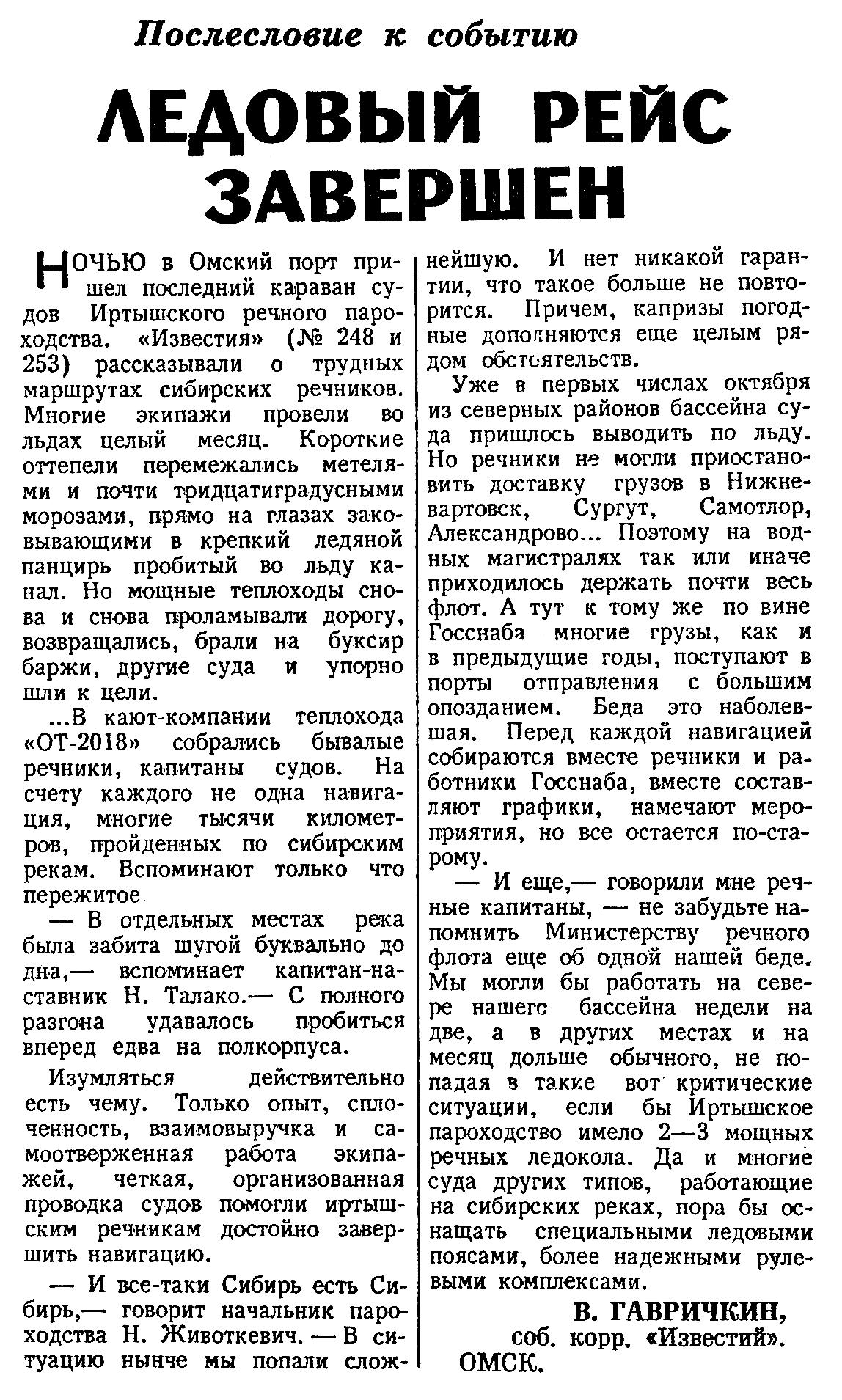 НОЧЬЮ в Омский порт пришел последний караван судов Иртышского речного пароходства. «Известия» (№ 248 и 253) рассказывали о трудных маршрутах сибирских речников. Многие экипажи провели во льдах целый месяц. Короткие оттепели перемежались метелями и почти тридцатиградусными морозами, прямо на глазах заковывающими в крепкий ледяной панцирь пробитый во льду канал. Но мощные теплоходы снова и снова проламывали дорогу, возвращались, брали на буксир баржи, другие суда и упорно шли к цели.