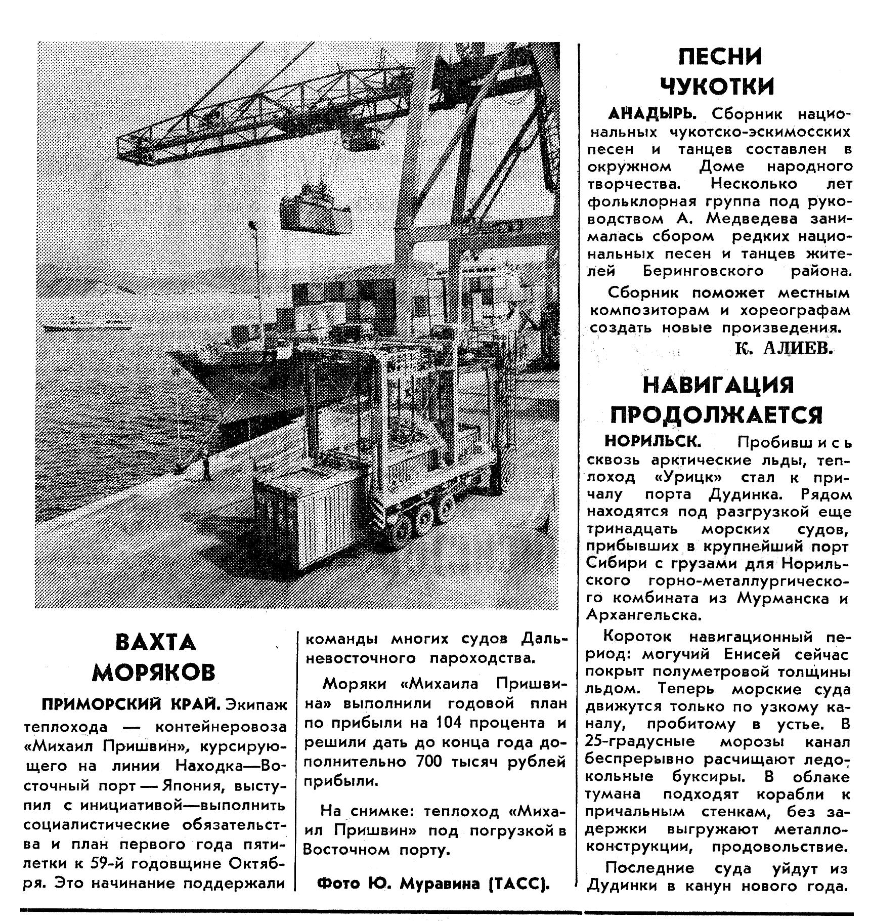 ПРИМОРСКИЙ КРАЙ. Экипаж теплохода — контейнеровоза «Михаил Пришвин», курсирующего на линии Находка—Восточный порт — Япония, выступил с инициативой — выполнить социалистические обязательства и план первого года пятилетки к 59-й годовщине Октября. Это начинание поддержали команды многих судов Дальневосточного пароходства.