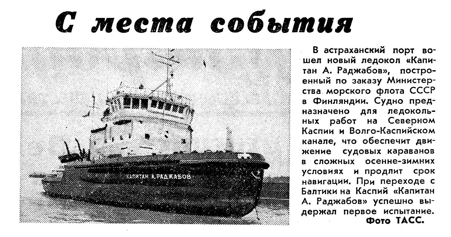 В астраханский порт вошел новый ледокол «Капитан А. Раджабов», построенный по заказу Министерства морского флота СССР в Финляндии. Судно предназначено для ледокольных работ на Северном Каспии и Волго-Каспийском канале, что обеспечит движение судовых караванов в сложных осенне-зимних условиях и продлит срок навигации. При переходе с Балтики на Каспий «Капитан А. Раджабов» успешно выдержал первое испытание.