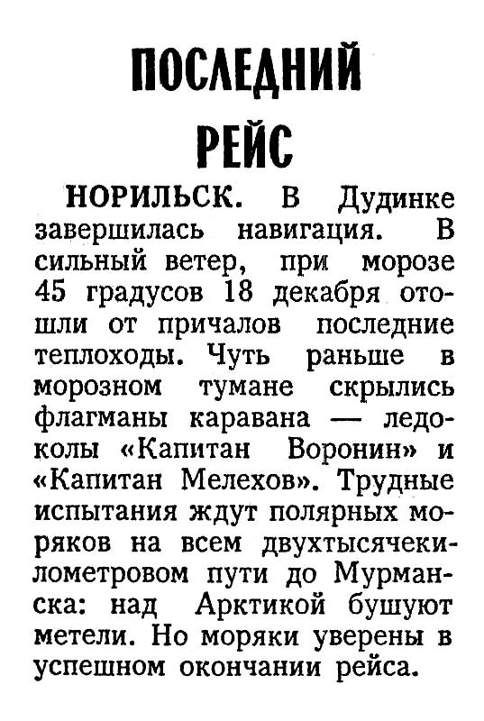 НОРИЛЬСК. В Дудинке завершилась навигация. В сильный ветер, при морозе 45 градусов 18 декабря отошли от причалов последние теплоходы. Чуть раньше в морозном тумане скрылись флагманы каравана — ледоколы «Капитан Воронин» и «Капитан Мелехов». Трудные испытания ждут полярных моряков на всем двухтысячекилометровом пути до Мурманска: над Арктикой бушуют метели. Но моряки уверены в успешном окончании рейса.