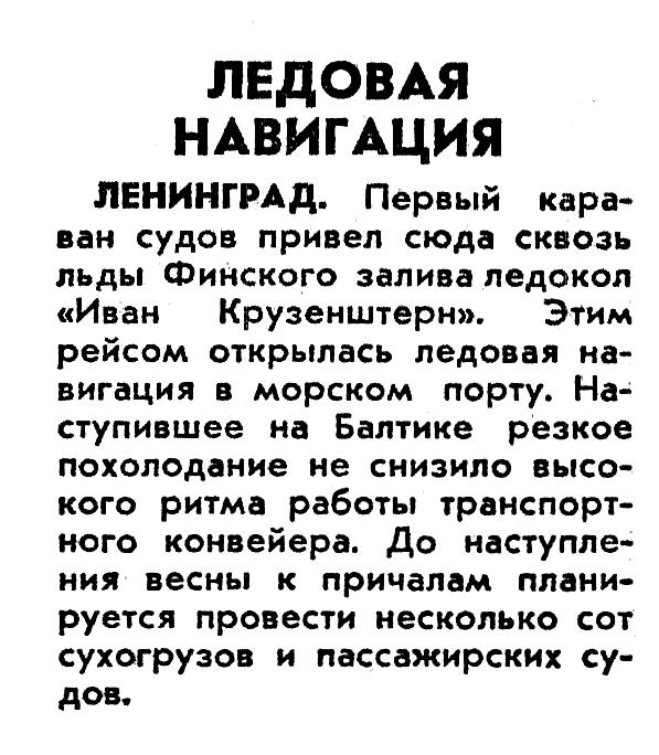 ЛЕНИНГРАД. Первый караван судов привел сюда сквозь льды Финского залива ледокол «Иван Крузенштерн». Этим рейсом открылась ледовая навигация в морском порту. Наступившее на Балтике резкое похолодание не снизило высокого ритма работы транспортного конвейера. До наступления весны к причалам планируется провести несколько сот сухогрузов и пассажирских судов.