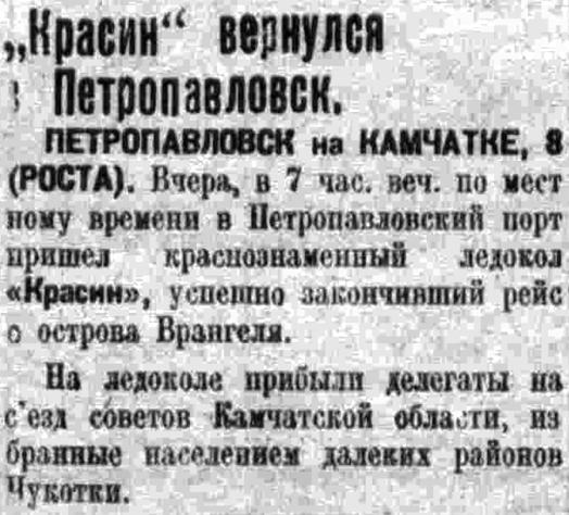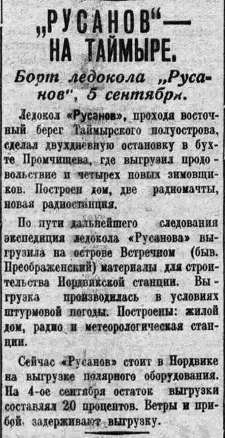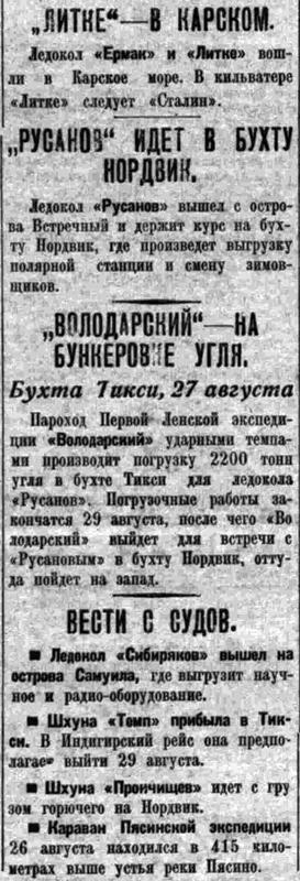 ЛЕДОРЕЗ "ЛИТКЕ" — В ЕНИСЕЙСКОМ ЗАЛИВЕ.Борт "Сакко", 13 сентября.По сведениям, полненным радиостанцией Главсевморпути с парохода «Сакко», ледорез «Литке» стоит в Енисейском заливе. Ледокол «Русанов» подходит к мысу «Челюскина», «Красин» — в районе о. Врангеля.